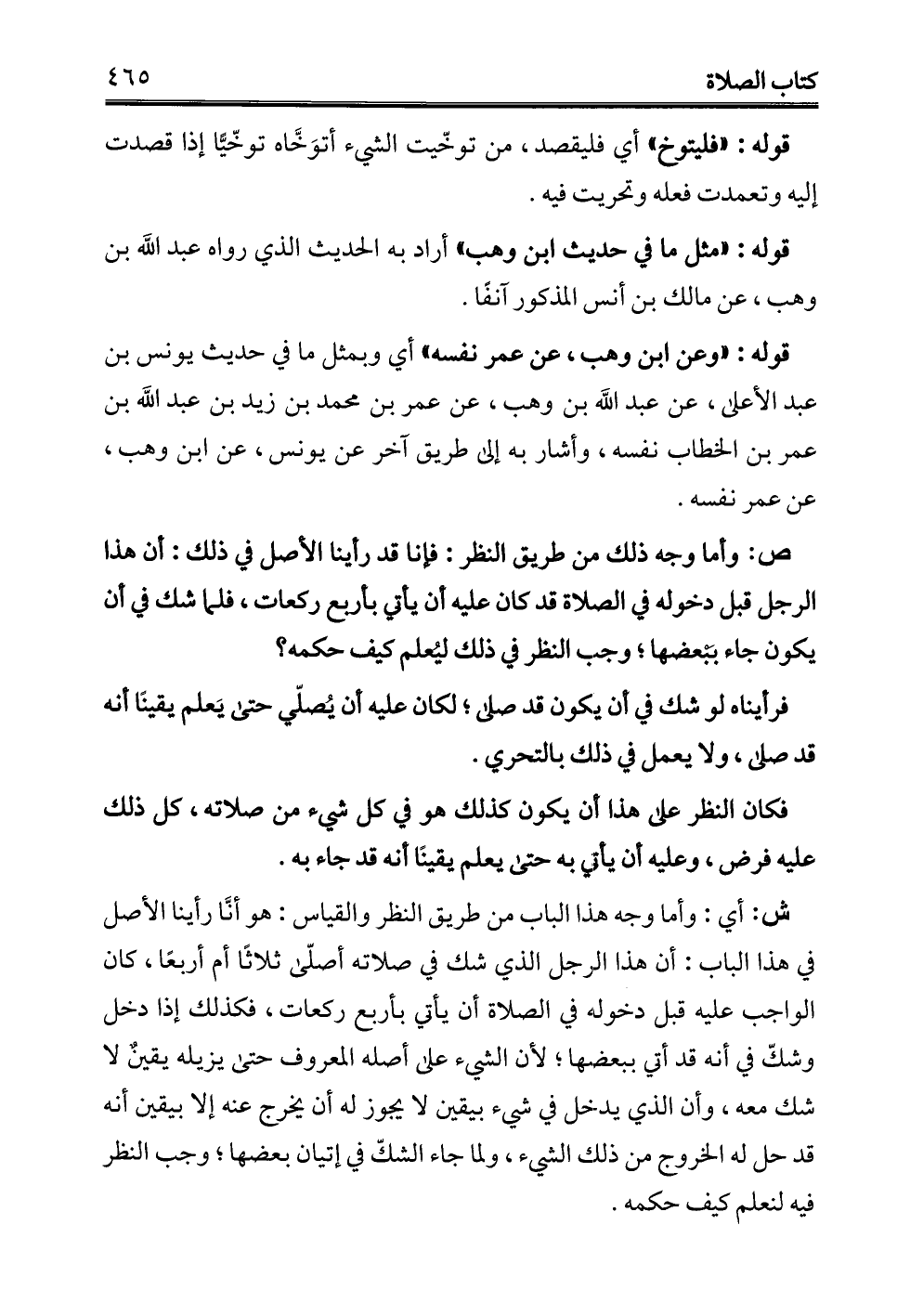 فكان النظر على هذا أن يكون كذلك هو في كل شيء من صلاته، كل ذلك عليه فرض، وعليه أن يأتي به حتى يعلم يقينًا أنه قد جاء به.