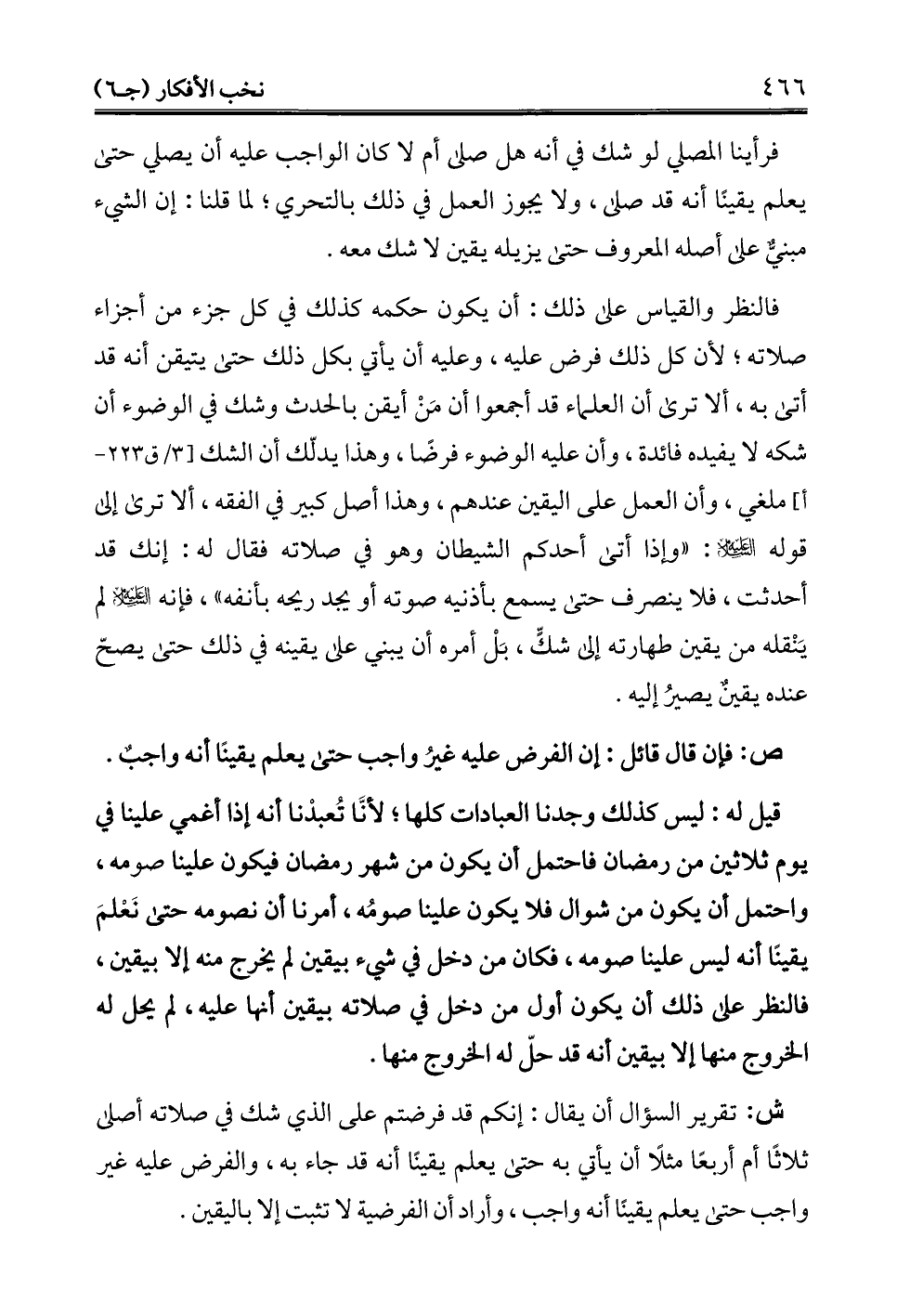 ش: تقرير السؤال أن يقال: إنكم قد فرضتم على الذي شك في صلاته أصلى ثلاثًا أم أربعًا مثلًا أن يأتي به حتى يعلم يقينًا أنه قد جاء به، والفرض عليه غير واجب حتى يعلم يقينًا أنه واجب، وأراد أن الفرضية لا تثبت إلا باليقين.
