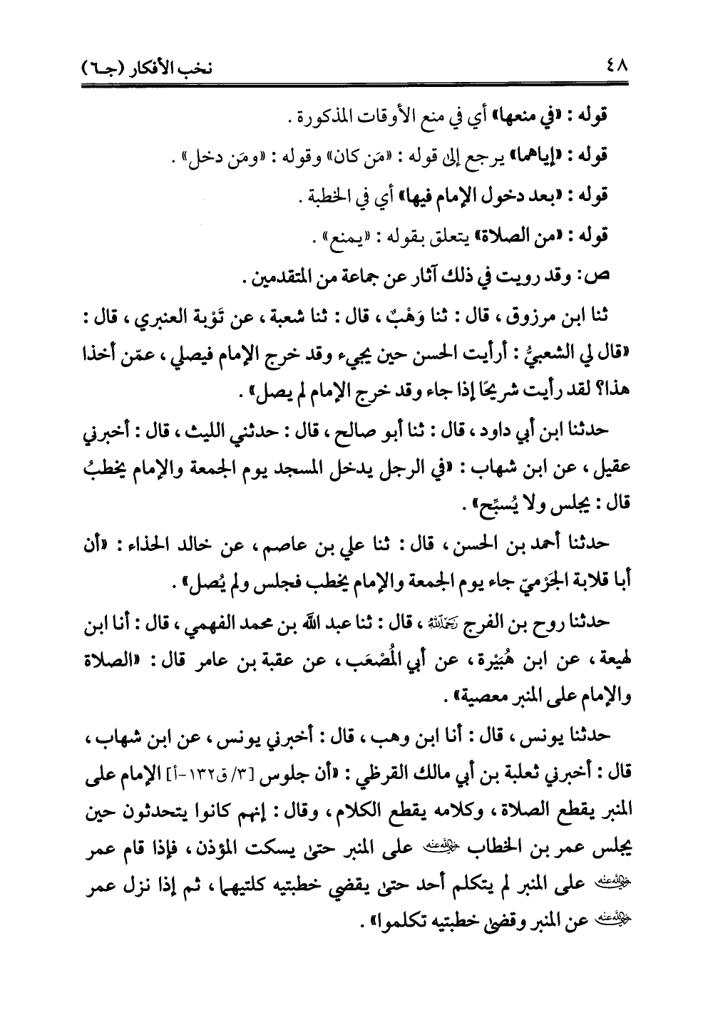 حدثنا يونس، قال: أنا ابن وهب، قال: أخبرني يونس، عن ابن شهاب، قال: أخبرني ثعلبة بن أبي مالك القرظي: "أن جلوس الإمام على المنبر يقطع الصلاة، وكلامه يقطع الكلام، وقال: إنهم كانوا يتحدثون حين يجلس عمر بن الخطاب - رضي الله عنه - على المنبر حتى يسكت المؤذن، فإذا قام عمر - رضي الله عنه - على المنبر لم يتكلم أحد حتى يقضي خطبتيه كلتيهما، ثم إذا نزل عمر - رضي الله عنه - عن المنبر وقضى خطبتيه تكلموا".