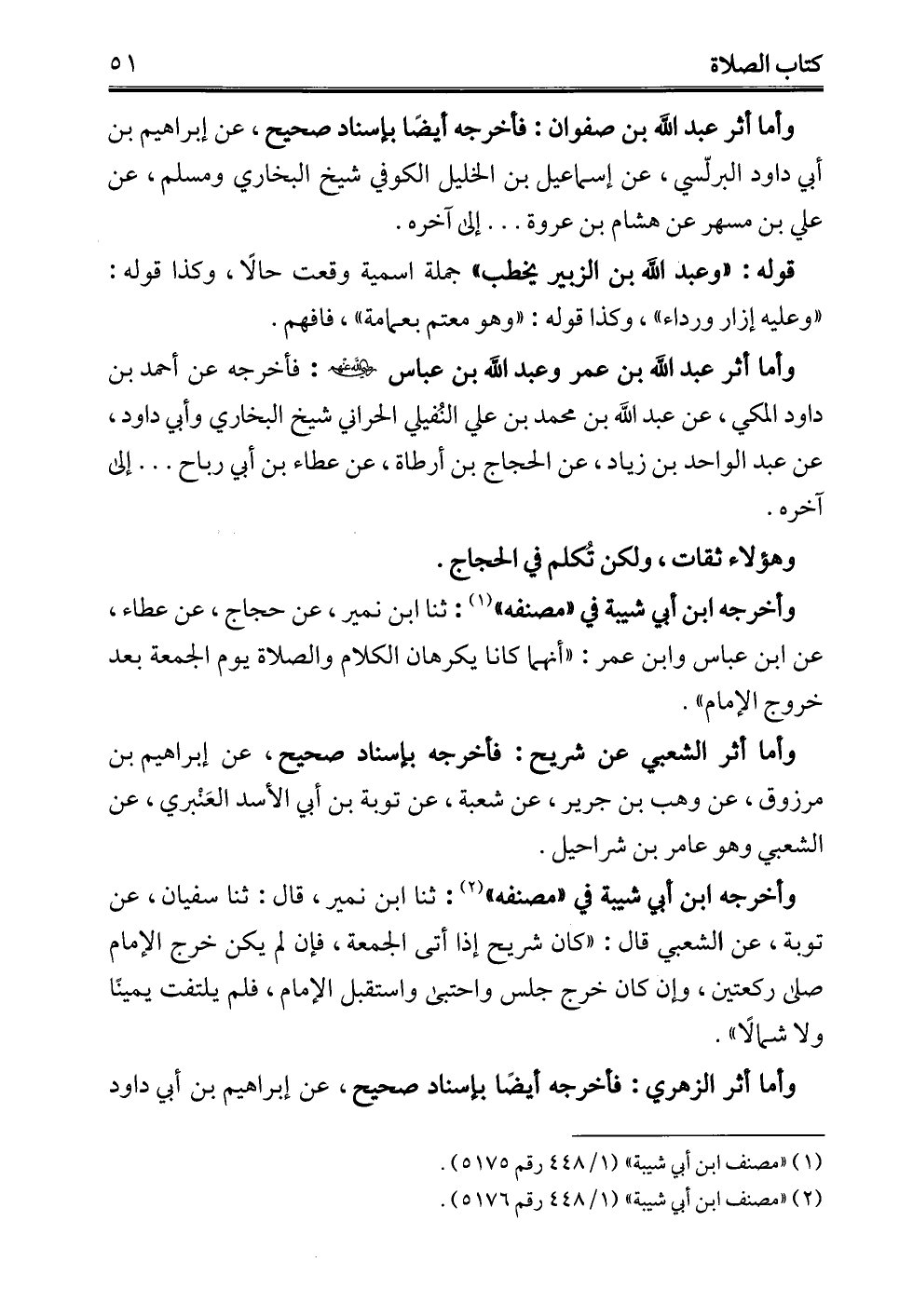 وأما أثر عبد الله بن صفوان: فأخرجه أيضًا بإسناد صحيح، عن إبراهيم بن أبي داود البرلّسي، عن إسماعيل بن الخليل الكوفي شيخ البخاري ومسلم، عن علي بن مسهر عن هشام بن عروة ... إلى آخره.