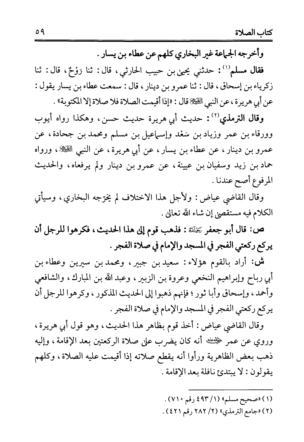 فقال مسلم (¬1): حدثني يحيى بن حبيب الحارثي، قال: ثنا رَوْحٌ، قال: ثنا زكرياء بن إسحاق، قال: ثنا عمرو بن دينار، قال: سمعت عطاء بن يسار يقول: عن أبي هريرة، عن النبي - عليه السلام - قال: "إذا أقيمت الصلاة فلا صلاة إلا المكتوبة".