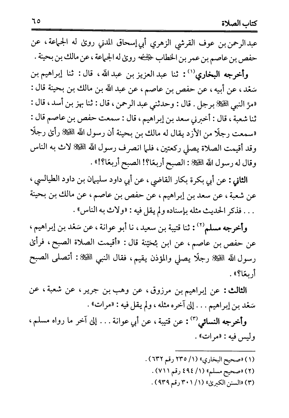 عبد الرحمن بن عوف القرشي الزهري أبي إسحاق المدني روى له الجماعة، عن حفص بن عاصم بن عمر بن الخطاب - رضي الله عنه - روى له الجماعة، عن مالك بن بحينة.