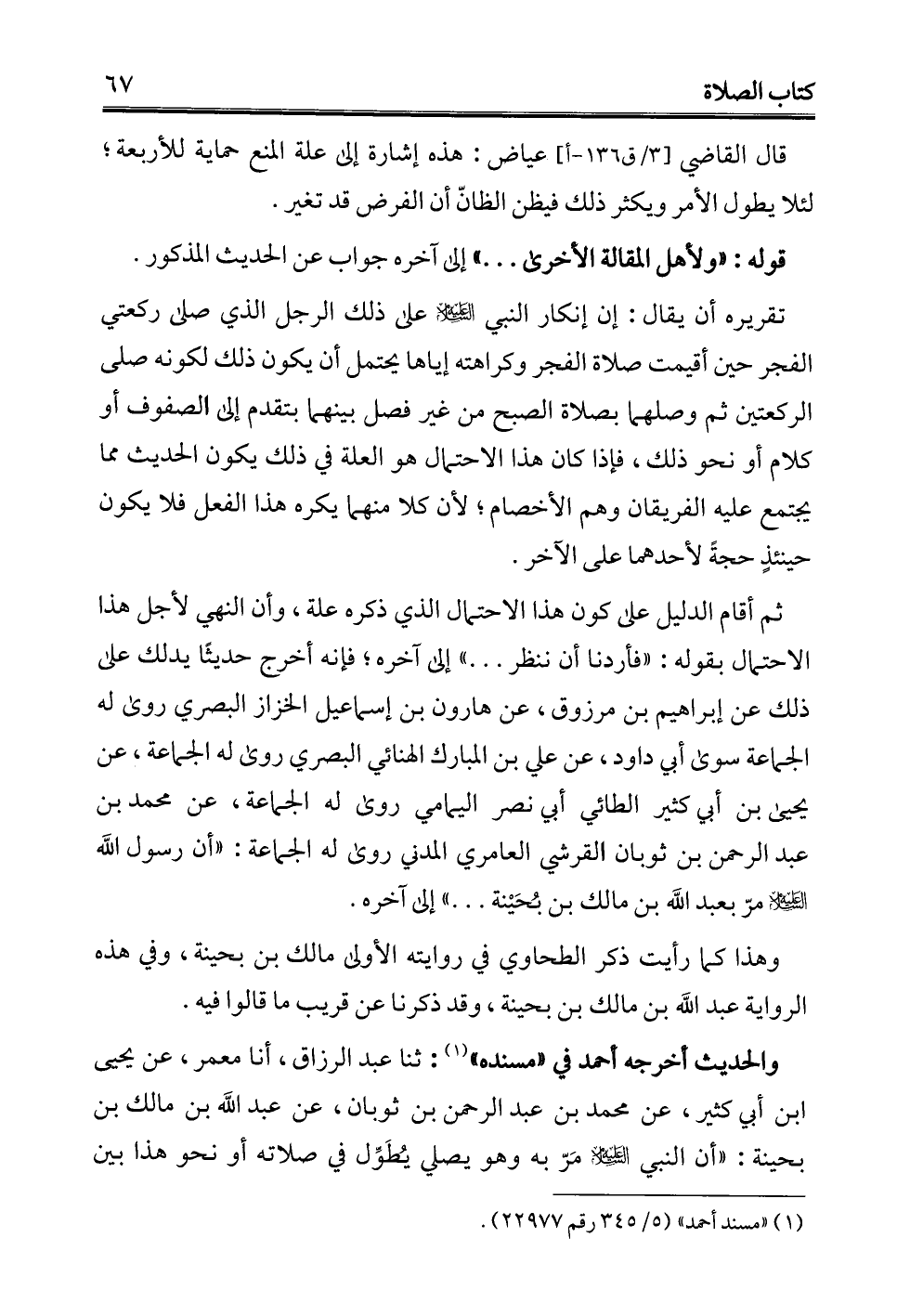 ثم أقام الدليل علي كون هذا الاحتمال الذي ذكره علة، وأن النهي لأجل هذا الاحتمال بقوله: "فأردنا أن ننظر ... " إلى آخره؛ فإنه أخرج حديثًا يدلك على ذلك عن إبراهيم بن مرزوق، عن هارون بن إسماعيل الخزاز البصري روى له الجماعة سوى أبي داود، عن علي بن المبارك الهنائي البصري روى له الجماعة، عن يحيى بن أبي كثير الطائي أبي نصر اليمامي روى له الجماعة، عن محمد بن عبد الرحمن بن ثوبان القرشي العامري المدني روى له الجماعة: "أن رسول الله - عليه السلام - مرّ بعبد الله بن مالك بن بُحَيْنة ... " إلى آخره.