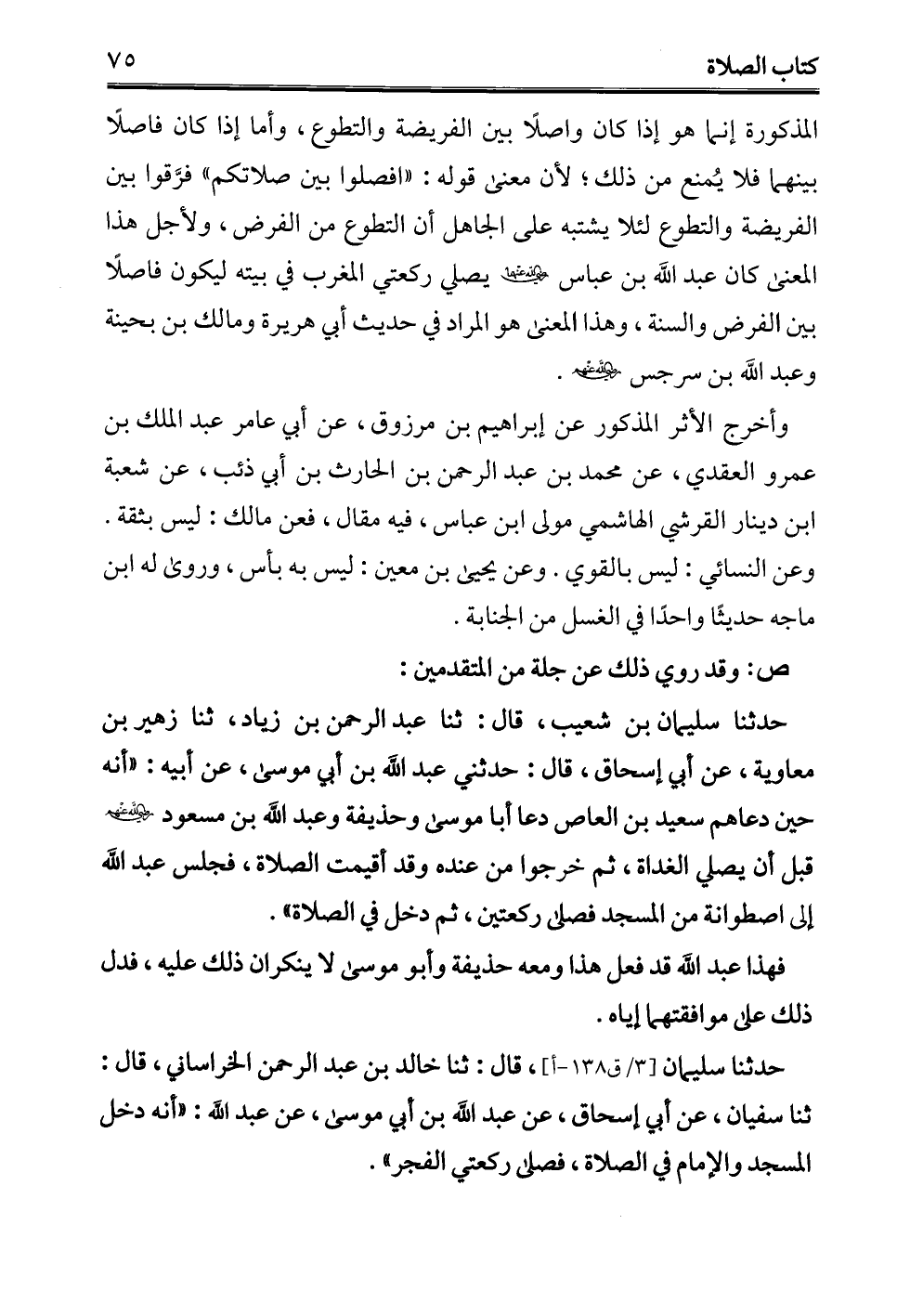 حدثنا سليمان بن شعيب، قال: ثنا عبد الرحمن بن زياد، ثنا زهير بن معاوية، عن أبي إسحاق، قال: حدثني عبد الله بن أبي موسى، عن أبيه: "أنه حين دعاهم سعيد بن العاص دعا أبا موسى وحذيفة وعبد الله بن مسعود - رضي الله عنهم - قبل أن يصلي الغداة، ثم خرجوا من عنده وقد أقيمت الصلاة، فجلس عبد الله إلى اصطوانة من المسجد فصلى ركعتين، ثم دخل في الصلاة".