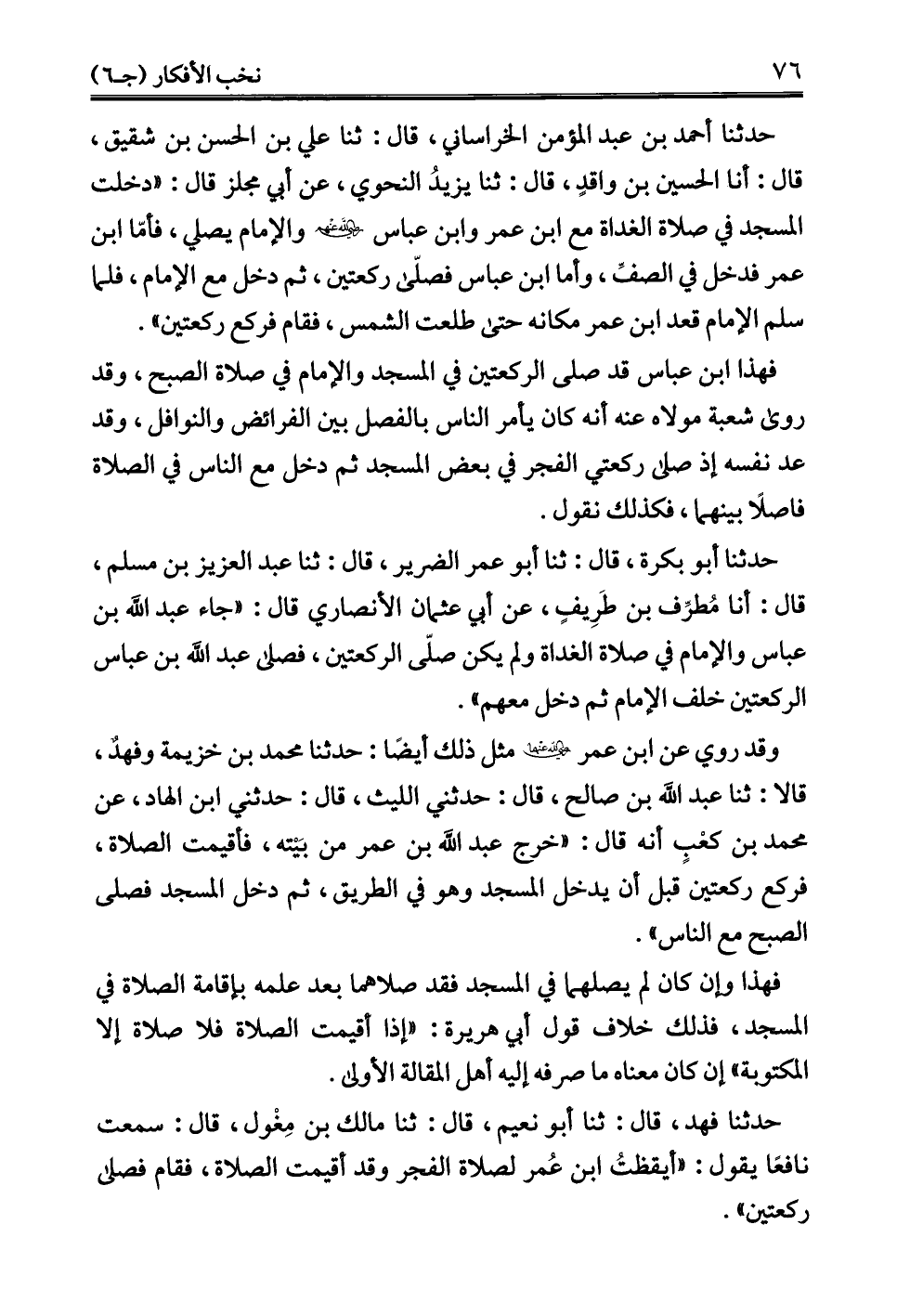 حدثنا أحمد بن عبد المؤمن الخراساني، قال: ثنا علي بن الحسن بن شقيق، قال: أنا الحسين بن واقدٍ، قال: ثنا يزيدُ النحوي، عن أبي مجلز قال: "دخلت المسجد في صلاة الغداة مع ابن عمر وابن عباس - رضي الله عنهم - والإمام يصلي، فأمّا ابن عمر فدخل في الصفِّ، وأما ابن عباس فصلّى ركعتين، ثم دخل مع الإِمام، فلما سلم الإِمام قعد ابن عمر مكانه حتى طلعت الشمس، فقام فركع ركعتين".