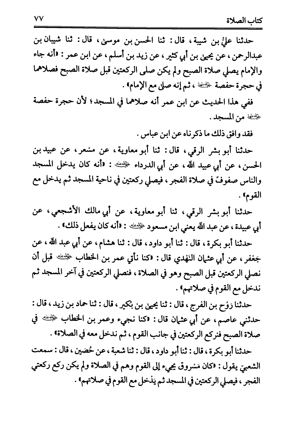 حدثنا عليُّ بن شيبة، قال: ثنا الحسن بن موسى، قال: ثنا شيبان بن عبد الرحمن، عن يحيى بن أبي كثير، عن زيد بن أسلم، عن ابن عمر: "أنه جاء والإمام يصلي صلاة الصبح ولم يكن صلى الركعتين قبل صلاة الصبح فصلاهما في حجرة حفصة - رضي الله عنها -، ثم إنه صلى مع الإمام".
