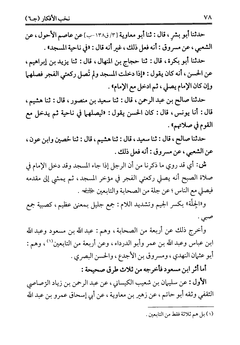 حدثنا أبو بشرٍ، قال: ثنا أبو معاوية عن عاصم الأحول، عن الشعبي، عن مسروق: أنه فعل ذلك، غير أنه قال: "في ناحية المسجد".