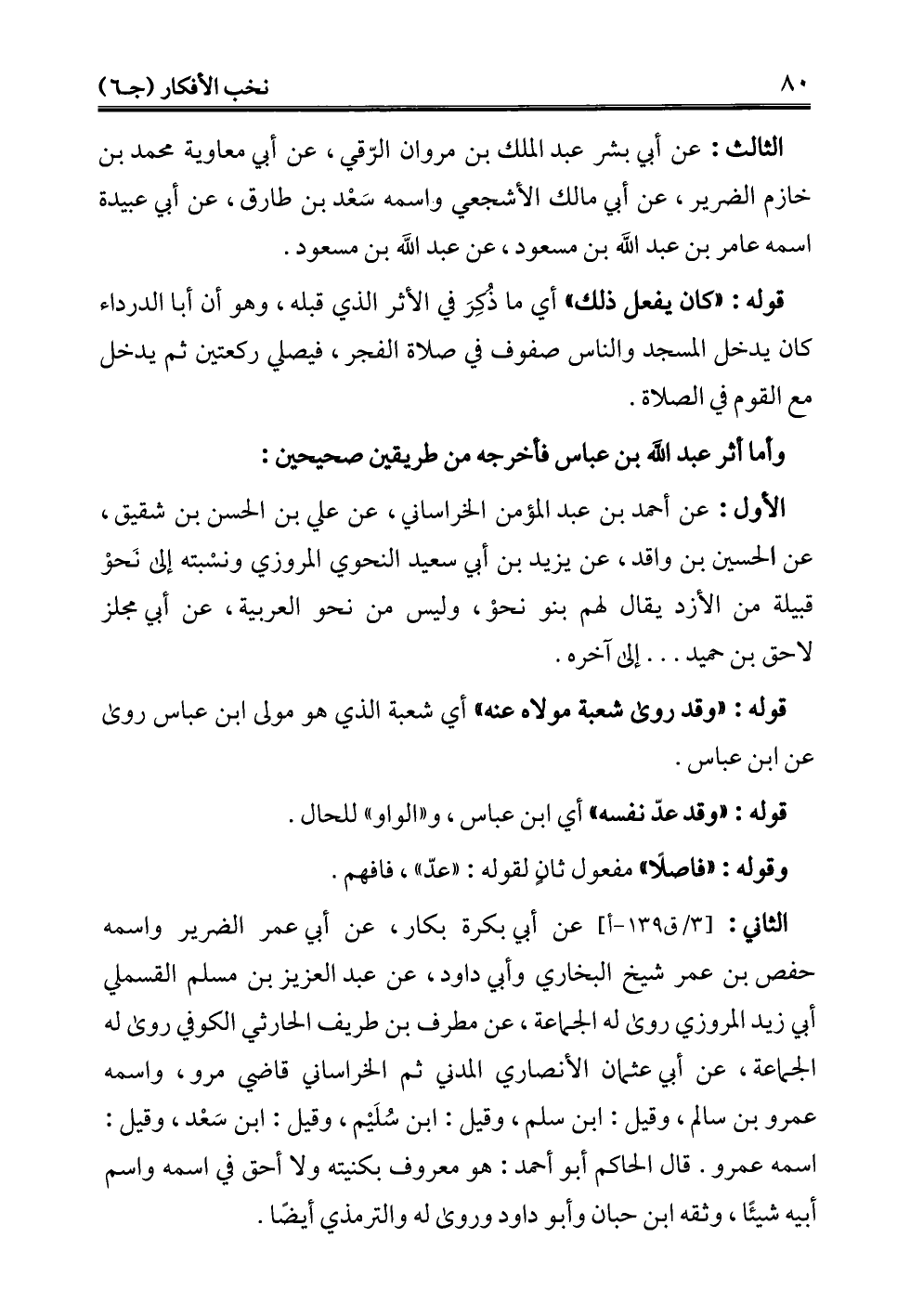 الثاني: عن أبي بكرة بكار، عن أبي عمر الضرير واسمه حفص بن عمر شيخ البخاري وأبي داود، عن عبد العزيز بن مسلم القسملي أبي زيد المروزي روى له الجماعة، عن مطرف بن طريف الحارثي الكوفي روى له الجماعة، عن أبي عثمان الأنصاري المدني ثم الخراساني قاضي مرو، واسمه عمرو بن سالم، وقيل: ابن سلم، وقيل: ابن سُلَيْم، وقيل: ابن سَعْد، وقيل: اسمه عمرو. قال الحاكم أبو أحمد: هو معروف بكنيته ولا أحق في اسمه واسم أبيه شيئًا، وثقه ابن حبان وأبو داود وروى له والترمذي أيضًا.