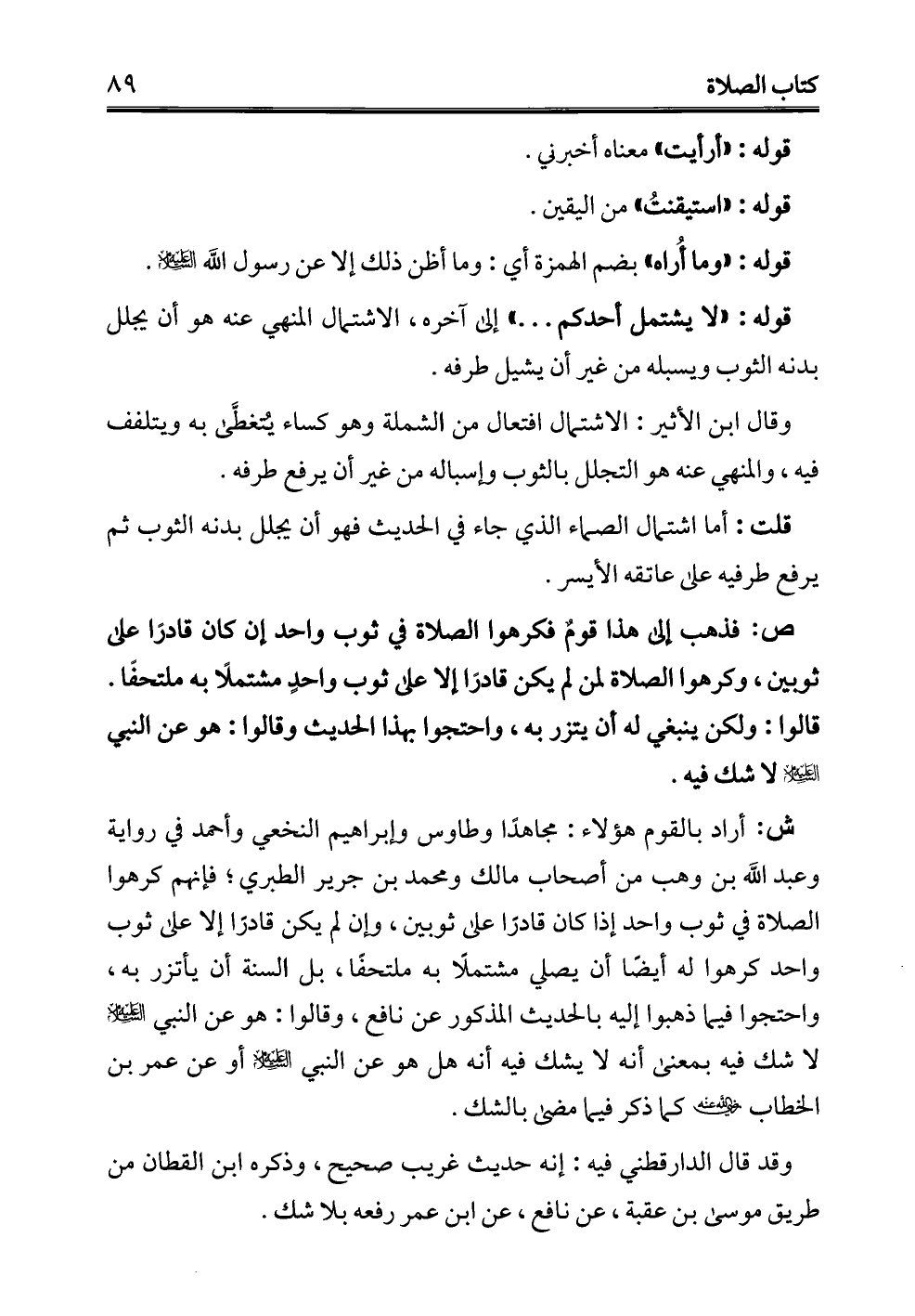 ص: فذهب إلى هذا قومٌ فكرهوا الصلاة في ثوب واحد إن كان قادرًا على ثوبين، وكرهوا الصلاة لمن لم يكن قادرًا إلا على ثوب واحدٍ مشتملًا به ملتحفًا. قالوا: ولكن ينبغي له أن يتزر به، واحتجوا بهذا الحديث وقالوا: هو عن النبي - عليه السلام - لا شك فيه.