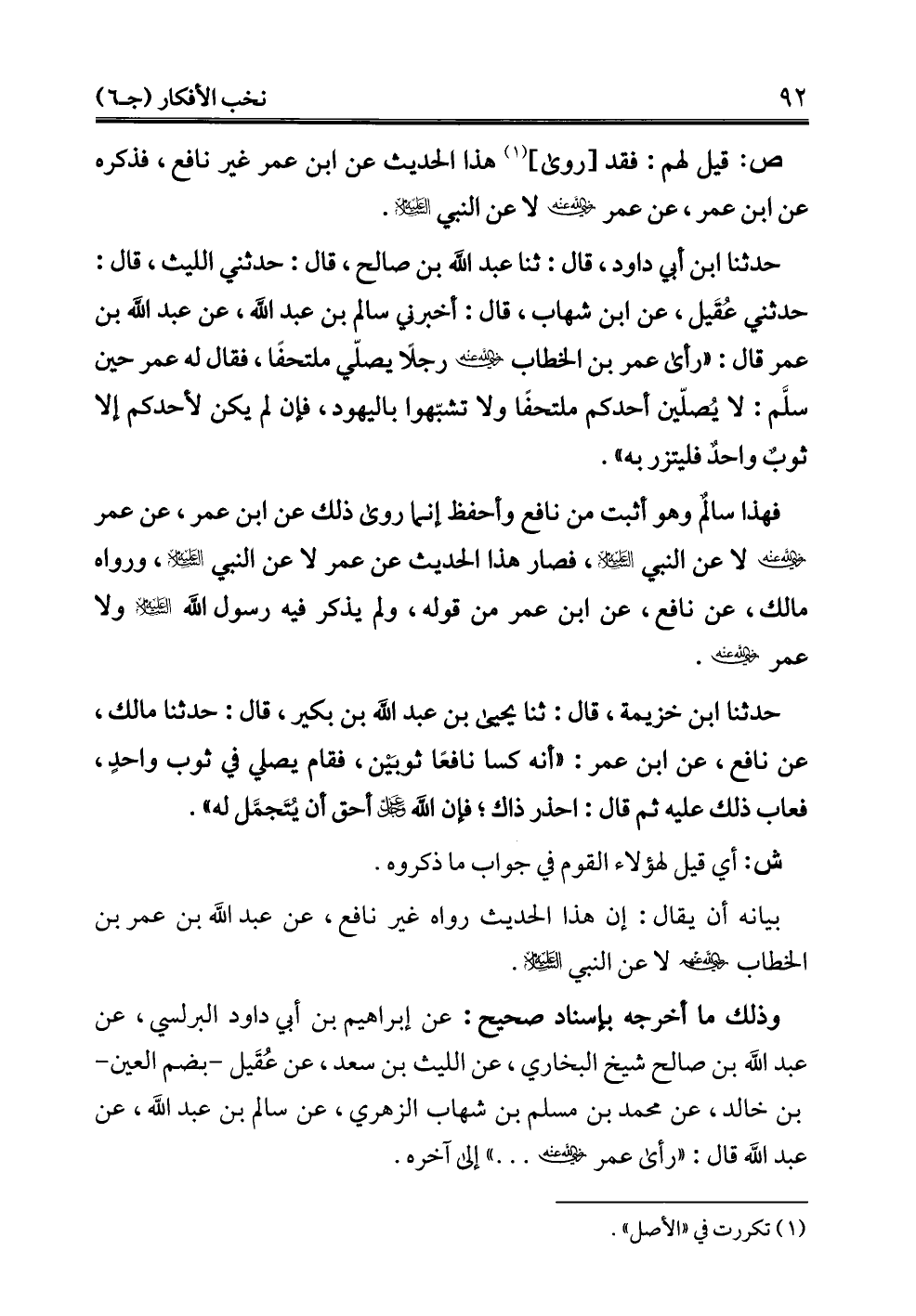 بيانه أن يقال: إن هذا الحديث رواه غير نافع، عن عبد الله بن عمر بن الخطاب - رضي الله عنه - لا عن النبي - عليه السلام -.