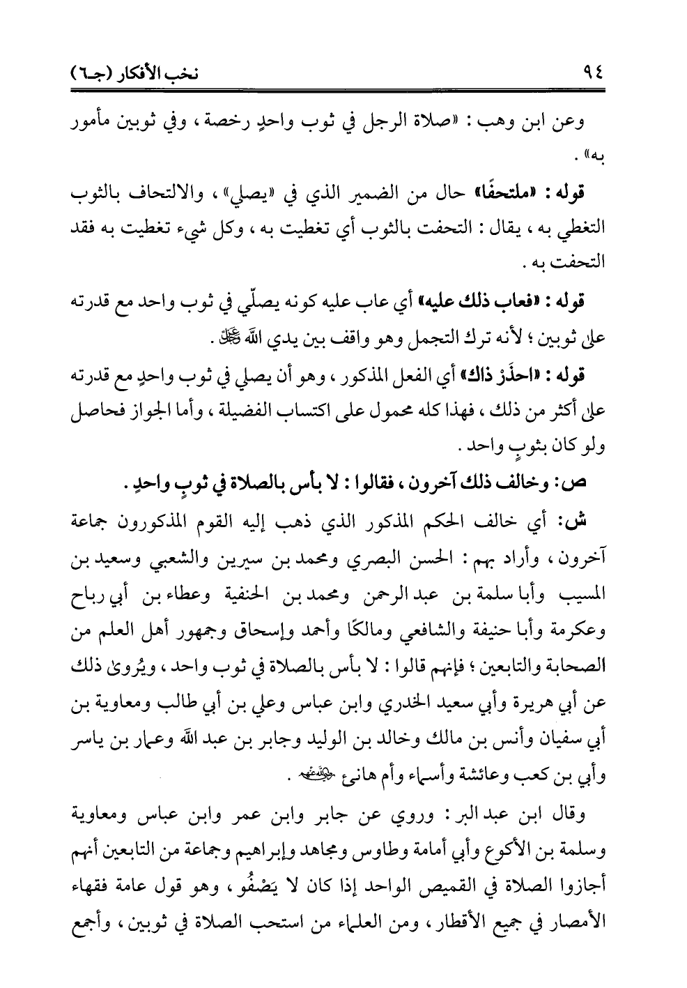 وقال ابن عبد البر: وروي عن جابر وابن عمر وابن عباس ومعاوية وسلمة بن الأكوع وأبي أمامة وطاوس ومجاهد وإبراهيم وجماعة من التابعين أنهم أجازوا الصلاة في القميص الواحد إذا كان لا يَصْفُو، وهو قول عامة فقهاء الأمصار في جميع الأقطار، ومن العلماء من استحب الصلاة في ثوبين، وأجمع