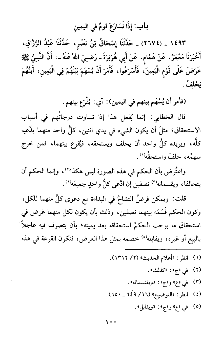 1493 - (2674) - حَدَّثَنَا إِسْحَاقُ بْنُ نَصْرٍ، حَدَّثَنَا عَبْدُ الرَّزَاقِ، أَخْبَرَنَا مَعْمَرٌ، عَنْ هَمَّامٍ، عَنْ أَبِي هُرَيْرَةَ -رَضِيَ اللهُ عَنْهُ-: أَنَّ النَّبِيَّ - صلى الله عليه وسلم - عَرَضَ عَلَى قَوْمٍ الْيَمِينَ، فَأَسْرَعُوا، فَأَمَرَ أَنْ يُسْهَمَ بَيْنَهُمْ فِي الْيَمِينِ، أَيُّهُمْ يَحْلِفُ.