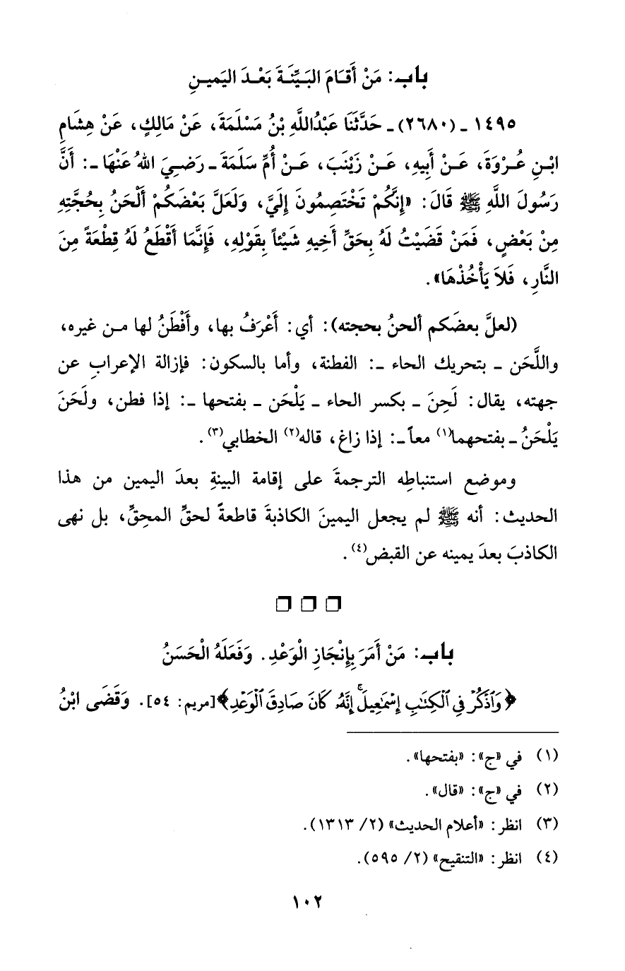 1495 - (2680) - حَدَّثَنَا عَبْدُ اللهِ بْنُ مَسْلَمَةَ، عَنْ مَالِكٍ، عَنْ هِشَامِ ابْنِ عُرْوَةَ، عَنْ أَبِيهِ، عَنْ زَينَبَ، عَنْ أُمِّ سَلَمَةَ -رَضِيَ اللهُ عَنْهَا-: أَنَّ رَسُولَ اللهِ - صلى الله عليه وسلم - قَالَ: "إِنَّكُمْ تَخْتَصِمُونَ إِلَيَّ، وَلَعَلَّ بَعْضَكُمْ أَلْحَنُ بِحُجَّتِهِ مِنْ بَعْضٍ، فَمَنْ قَضَيْتُ لَهُ بِحَقِّ أَخِيهِ شَيْئاً بِقَوْلِهِ، فَإِنَّمَا أَقْطَعُ لَهُ قِطْعَةً مِنَ النَّارِ، فَلَا يَأْخُذْهَا".