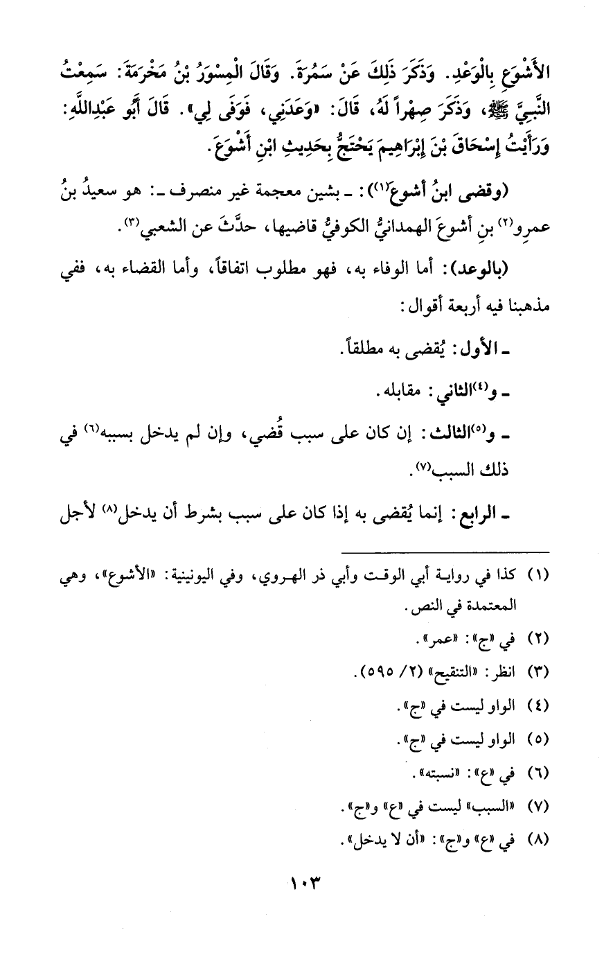 (بالوعد): أما الوفاء به، فهو مطلوب اتفاقاً، وأما القضاء به، ففي مذهبنا فيه أربعة أقوال: