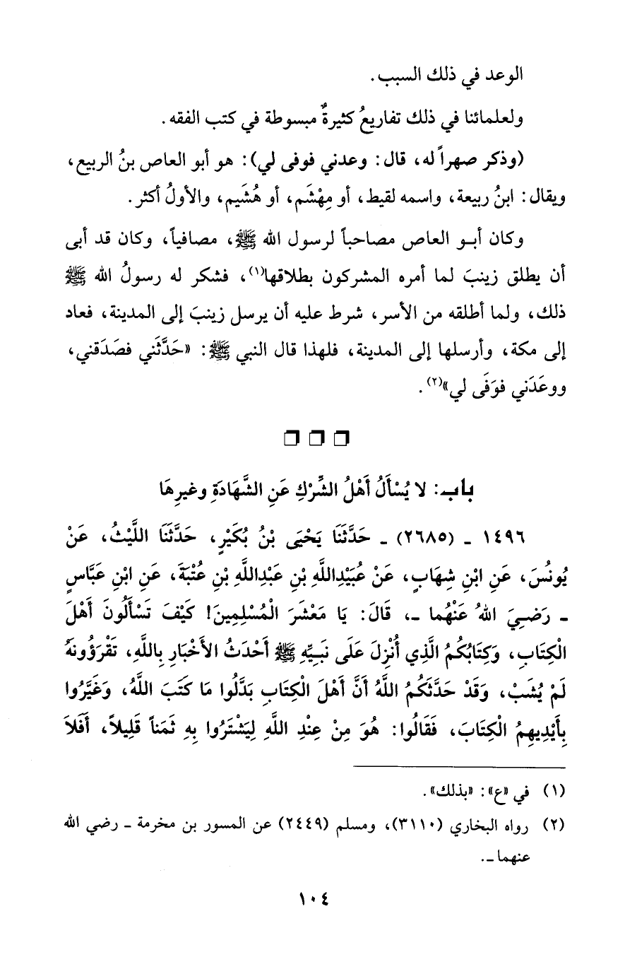 وكان أبو العاص مصاحباً لرسول الله - صلى الله عليه وسلم -، مصافياً، وكان قد أبى أن يطلق زينبَ لما أمره المشركون بطلاقها (¬1)، فشكر له رسولُ الله - صلى الله عليه وسلم - ذلك، ولما أطلقه من الأسر، شرط عليه أن يرسل زينبَ إلى المدينة، فعاد إلى مكة، وأرسلها إلى المدينة، فلهذا قال النبي - صلى الله عليه وسلم -: "حَدَّثَني فصَدَقني، ووعَدَني فوَفَى لي" (¬2).