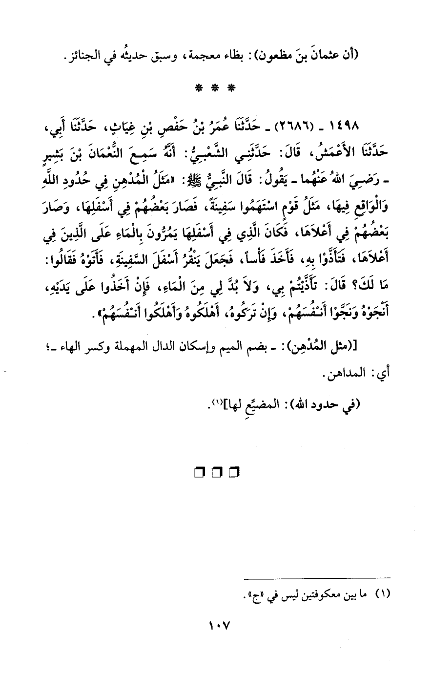 1498 - (2686) - حَدَّثَنَا عُمَرُ بْنُ حَفْصِ بْنِ غِيَاثٍ، حَدَّثَنَا أَبِي، حَدَّثَنَا الأَعْمَشُ، قَالَ: حَدَّثَنِي الشَّعْبِيُّ: أَنَّهُ سَمِعَ النُّعْمَانَ بْنَ بَشِيرٍ -رَضِيَ اللهُ عَنْهُما- يَقُولُ: قَالَ النَّبِيُّ - صلى الله عليه وسلم -: "مَثَلُ الْمُدْهِنِ فِي حُدُودِ اللهِ وَالْوَاقِعِ فِيهَا، مَثَلُ قَوْمٍ اسْتَهَمُوا سَفِينَةً، فَصَارَ بَعْضُهُمْ فِي أَسْفَلِهَا، وَصَارَ بَعْضُهُمْ فِي أَعْلَاهَا، فَكَانَ الَّذِي فِي أَسْفَلِهَا يَمُرُّونَ بِالْمَاءِ عَلَى الَّذِينَ فِي أَعْلَاهَا، فَتَأَذَّوْا بِهِ، فَأَخَذَ فَأْساً، فَجَعَلَ يَنْقُرُ أَسْفَلَ السَّفِينَةِ، فَأَتَوْهُ فَقَالُوا: مَا لَكَ؟ قَالَ: تَأَذَّيْتُمْ بِي، وَلَا بُدَّ لِي مِنَ الْمَاءِ، فَإِنْ أَخَذُوا عَلَى يَدَيْهِ، أَنْجَوْهُ وَنَجَّوْا أَنْفُسَهُمْ، وَإِنْ تَرَكُوهُ، أَهْلَكُوهُ وَأَهْلَكُوا أَنْفُسَهُمْ".