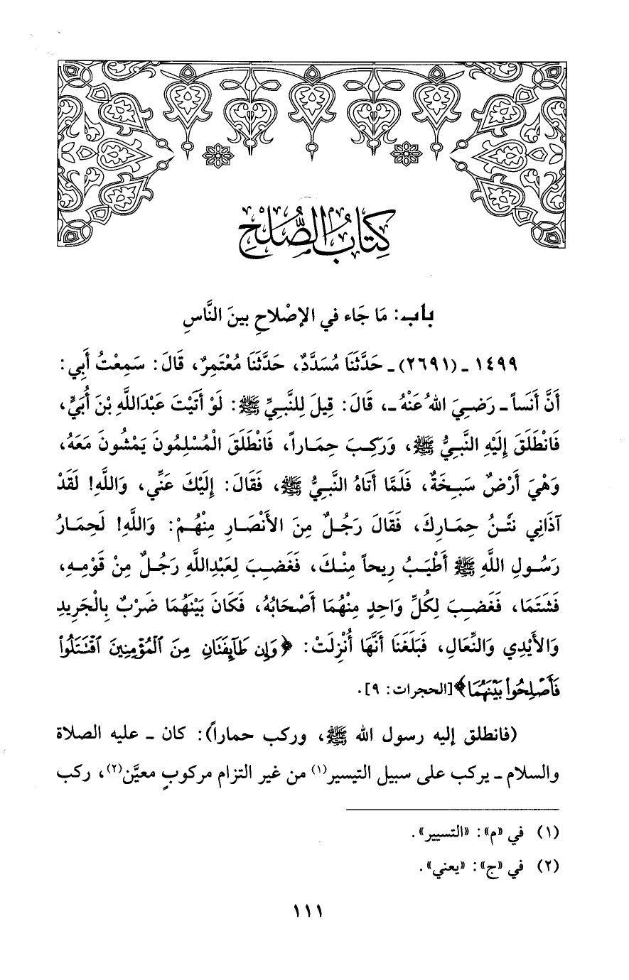 1499 - (2691) - حَدَّثَنَا مُسَدَّدٌ، حَدَّثَنَا مُعْتَمِرٌ، قَالَ: سَمِعْتُ أَبِي: أَنَّ أَنَساً -رَضِيَ اللهُ عَنْهُ-، قَالَ: قِيلَ لِلنَّبِيِّ - صلى الله عليه وسلم -: لَوْ أَتَيْتَ عَبْدَ اللهِ بْنَ أُبَيٍّ، فَانْطَلَقَ إِلَيْهِ النَّبِيُّ - صلى الله عليه وسلم -، وَرَكِبَ حِمَاراً، فَانْطَلَقَ الْمُسْلِمُونَ يَمْشُونَ مَعَهُ، وَهْيَ أَرْضٌ سَبِخَةٌ، فَلَمَّا أَتَاهُ النَّبِيُّ - صلى الله عليه وسلم -، فَقَالَ: إِلَيْكَ عَنِّي، وَاللهِ! لَقَدْ آذَانِي نَتْنُ حِمَارِكَ، فَقَالَ رَجُلٌ مِنَ الأَنْصَارِ مِنْهُمْ: وَاللهِ! لَحِمَارُ رَسُولِ اللهِ - صلى الله عليه وسلم - أَطْيَبُ رِيحاً مِنْكَ، فَغَضِبَ لِعَبْدِ اللهِ رَجُلٌ مِنْ قَوْمِهِ، فَشَتَمَا، فَغَضِبَ لِكُلِّ وَاحِدٍ مِنْهُمَا أَصْحَابُهُ، فَكَانَ بَيْنَهُمَا ضَرْبٌ بِالْجَرِيدِ وَالأَيْدِي وَالنِّعَالِ، فَبَلَغَنَا أَنَّهَا أُنْزِلَتْ: {وَإِنْ طَائِفَتَانِ مِنَ الْمُؤْمِنِينَ اقْتَتَلُوا فَأَصْلِحُوا بَيْنَهُمَا} [الحجرات: 9].