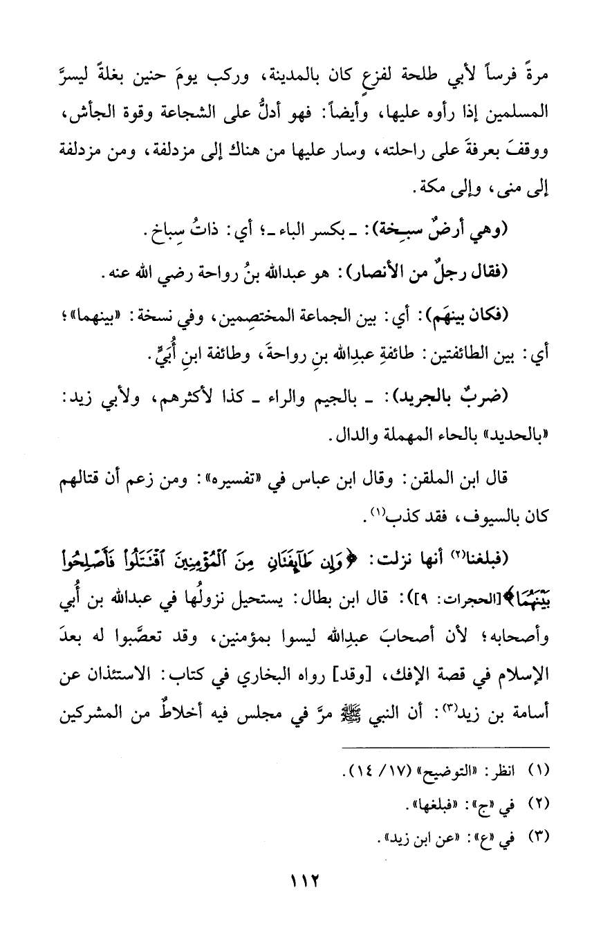 (فبلغنا (¬2) أما نزلت: {وَإِنْ طَائِفَتَانِ مِنَ الْمُؤْمِنِينَ اقْتَتَلُوا فَأَصْلِحُوا بَيْنَهُمَا} [الحجرات: 9]): قال ابن بطال: يستحيل نزولُها في عبد الله بن أُبي وأصحابه؛ لأن أصحابَ عبدِ الله ليسوا بمؤمنين، وقد تعصَّبوا له بعدَ الإسلام في قصة الإفك، [وقد] رواه البخاري في كتاب: الاستئذان عن أسامة بن زيد (¬3): أن النبي - صلى الله عليه وسلم - مرَّ في مجلس فيه أخلاطٌ من المشركين