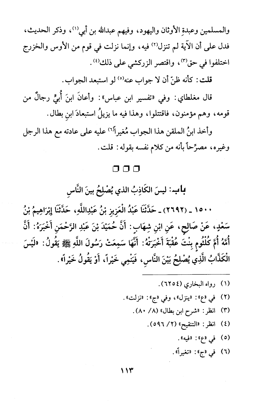 1500 - (2692) - حَدَّثَنَا عَبْدُ الْعَزِيزِ بْنُ عَبْدِ اللهِ، حَدَّثَنَا إِبْرَاهِيمُ بْنُ سَعْدٍ، عَنْ صَالِحٍ، عَنِ ابْنِ شِهَابٍ: أَنَّ حُمَيْدَ بْنَ عَبْدِ الرَّحْمَنِ أَخْبَرَهُ: أَنَّ أُمِّهُ أُمَّ كُلْثُومٍ بِنْتَ عُقْبَّةَ أَخْبَرَتْهُ: أَنَّهَا سَمِعَتْ رَسُولَ اللهِ - صلى الله عليه وسلم - يَقُولُ: "لَيْسَ الْكَذَّابُ الَّذِي يُصْلِحُ بَيْنَ النَّاسِ، فَيَنْمِي خَيْراً، أَوْ يَقُولُ خَيْراً".