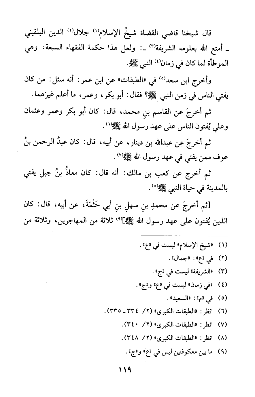 قال شيخنا قاضي القضاة شيخُ الإسلام (¬1) جلال (¬2) الدين البلقيني -أمتع الله بعلومه الشريفة (¬3) -: ولعلّ هذا حكمة الفقهاء السبعة، وهي الموطأة لما كان في زمان (¬4) النبي - صلى الله عليه وسلم -.