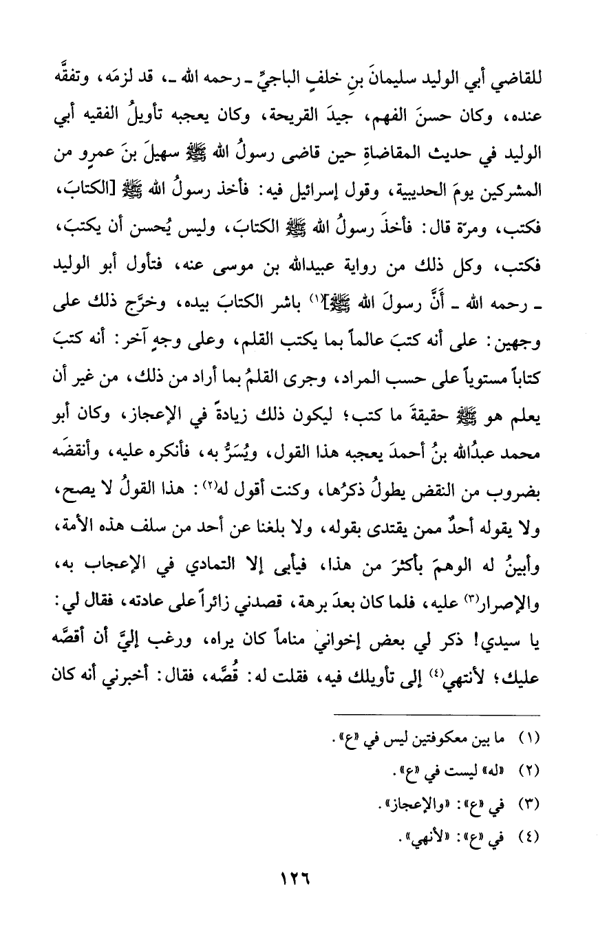 للقاضي أبي الوليد سليمانَ بنِ خلفٍ الباجيِّ -رحمه الله-، قد لزمَه، وتفقَّه عنده، وكان حسنَ الفهم، جيدَ القريحة، وكان يعجبه تأويلُ الفقيه أبي الوليد في حديث المقاضاةِ حين قاضى رسولُ الله - صلى الله عليه وسلم - سهيلَ بنَ عمرٍو من المشركين يومَ الحديبية، وقول إسرائيل فيه: فأخذ رسولُ الله - صلى الله عليه وسلم -[الكتابَ، فكتب، ومرّة قال: فأخذَ رسولُ الله - صلى الله عليه وسلم - الكتابَ، وليس يُحسن أن يكتبَ، فكتب، وكل ذلك من رواية عبيد الله بن موسى عنه، فتأول أبو الوليد -رحمه الله- أَنَّ رسولَ الله - صلى الله عليه وسلم -] (¬1) باشر الكتابَ بيده، وخرَّج ذلك على وجهين: على أنه كتبَ عالماً بما يكتب القلم، وعلى وجهٍ آخر: أنه كتبَ كتاباً مستوياً على حسب المراد، وجرى القلمُ بما أراد من ذلك، من غير أن يعلم هو - صلى الله عليه وسلم - حقيقةَ ما كتب؛ ليكون ذلك زيادةً في الإعجاز، وكان أبو محمد عبدُ الله بنُ أحمدَ يعجبه هذا القول، ويًسَرُّ به، فأنكره عليه، وأنقضَه بضروب من النقض يطولُ ذكرُها، وكنت أقول له (¬2): هذا القولُ لا يصح، ولا يقوله أحدٌ ممن يقتدى بقوله، ولا بلغنا عن أحد من سلف هذه الأمة، وأبينُ له الوهمَ بأكثرَ من هذا، فيأبى إلا التمادي في الإعجاب به، والإصرار (¬3) عليه، فلما كان بعدَ برهة، قصدني زائراً على عادته، ققال لي: يا سيدي! ذكر لي بعض إخواني مناماً كان يراه، ورغب إليَّ أن أقصَّه عليك؛ لأنتهي (¬4) إلى تأويلك فيه، فقلت له: قُصَّه، فقال: أخبرني أنه كان