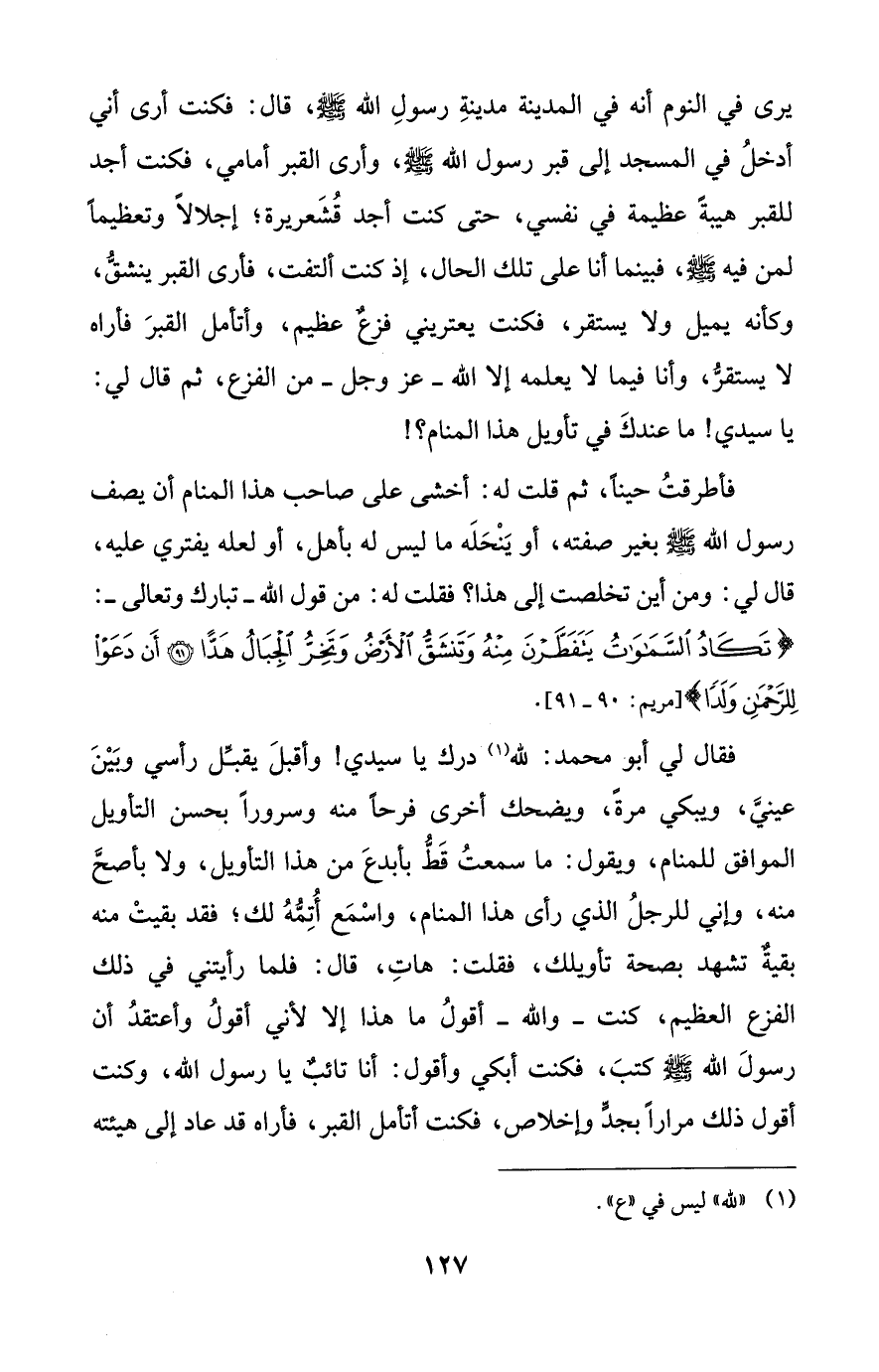 فأطرقتُ حيناً، ثم قلت له: أخشى على صاحب هذا المنام أن يصف رسول الله - صلى الله عليه وسلم - بغير صفته، أو يَنْحَلَه ما ليس له بأهل، أو لعله يفتري عليه، قال لي: ومن أين تخلصت إلى هذا؟ فقلت له: من قول الله -تبارك وتعالى-: {تَكَادُ السَّمَاوَاتُ يَتَفَطَّرْنَ مِنْهُ وَتَنْشَقُّ الْأَرْضُ وَتَخِرُّ الْجِبَالُ هَدًّا (90) أَنْ دَعَوْا لِلرَّحْمَنِ وَلَدًا} [مريم: 90 - 91].