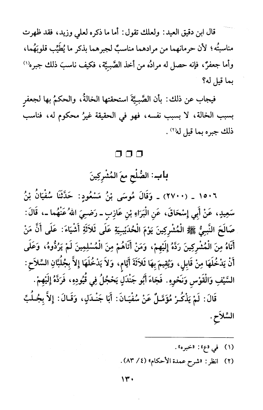 قال ابن دقيق العيد: ولعلك تقول: أما ما ذكره لعلي وزيد، فقد ظهرت مناسبتُه؛ لأن حرمانهما من مرادهما مناسبٌ لجبرهما بذكر ما يُطَيِّب قلوبَهُما، وأما جعفرٌ، فإنّه حصل له مرادُه من أخذ الصَّبِيَّة، فكيف ناسبَ ذلك جبره (¬1) بما قيل له؟
