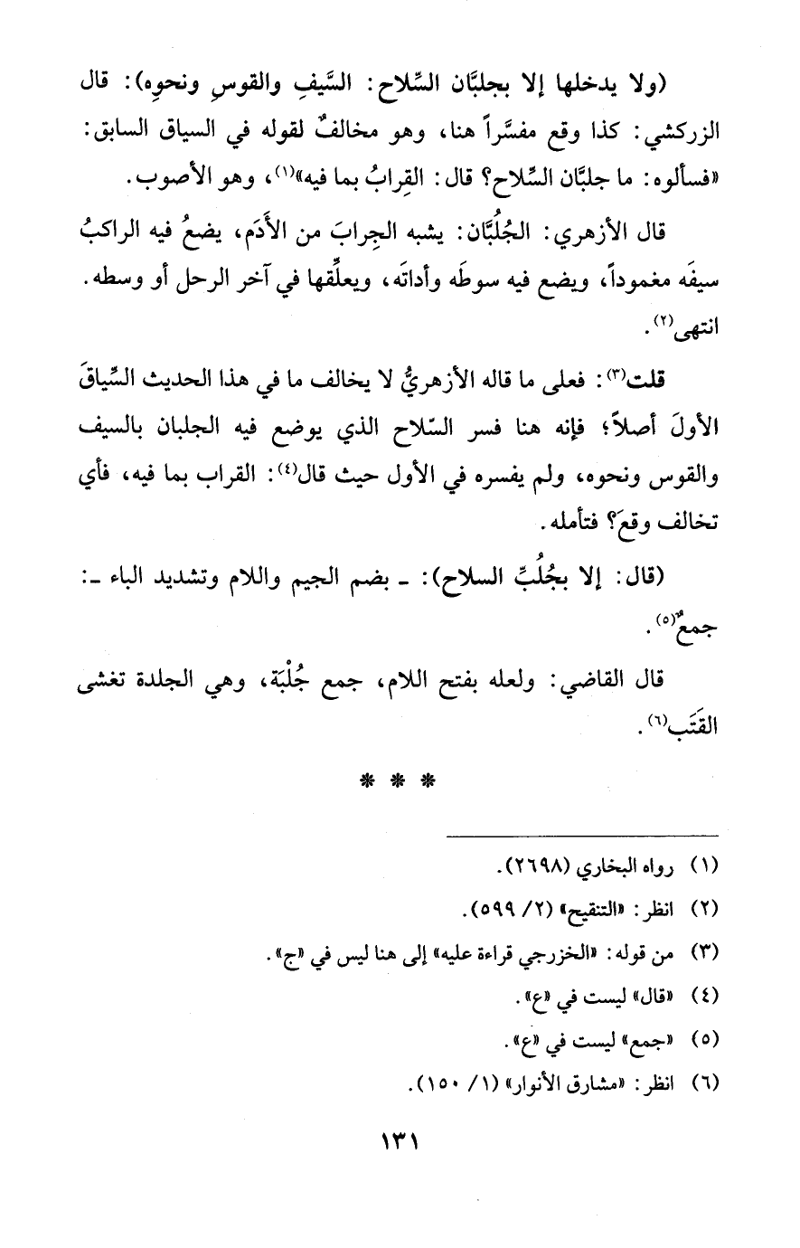 (ولا يدخلها إلا بجلبَّان السِّلاح: السَّيفِ والقوسِ ونحوِه): قال الزركشي: كذا وقع مفسَّراً هنا، وهو مخالفٌ لقوله في السياق السابق: "فسألوه: ما جلبَّان السِّلاح؟ قال: القِرابُ بما فيه" (¬1)، وهو الأصوب.