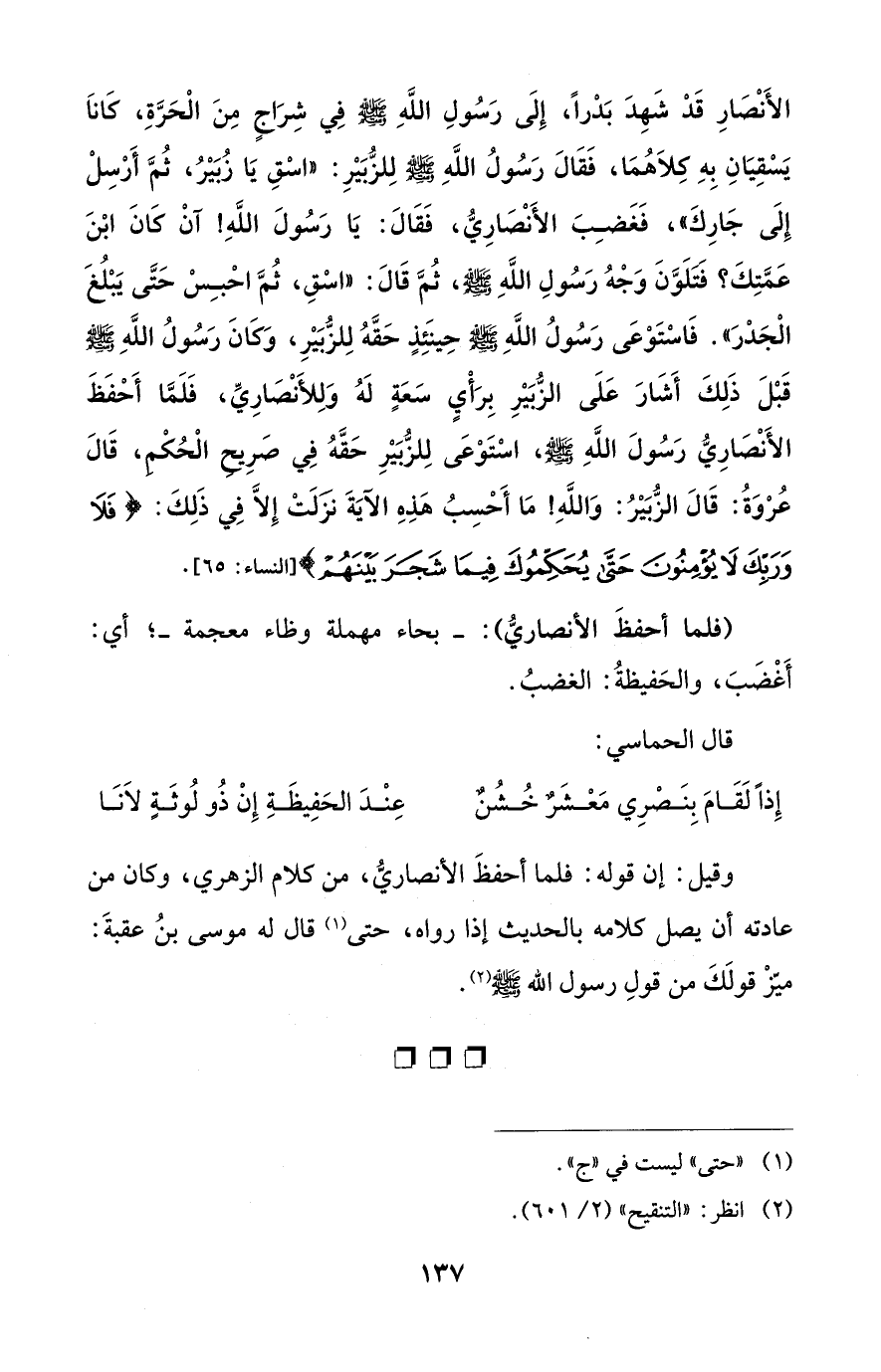 الأَنْصَارِ قَدْ شَهِدَ بَدْراً، إِلَى رَسُولِ اللهِ - صلى الله عليه وسلم - فِي شِرَاجٍ مِنَ الْحَرَّةِ، كَاناَ يَسْقِيَانِ بِهِ كِلَاهُمَا، فَقَالَ رَسُولُ اللهِ - صلى الله عليه وسلم - لِلزُّبَيْرِ: "اسْقِ يَا زُبَيْرُ، ثُمَّ أَرْسِلْ إِلَى جَارِكَ"، فَغَضِبَ الأَنْصَارِيُّ، فَقَالَ: يَا رَسُولَ اللهِ! آنْ كَانَ ابْنَ عَمَّتِكَ؟ فَتَلَوَّنَ وَجْهُ رَسُولِ اللهِ - صلى الله عليه وسلم -، ثُمَّ قَالَ: "اسْقِ، ثُمَّ احْبِسْ حَتَّى يَبْلُغَ الْجَدْرَ". فَاسْتَوْعَى رَسُولُ اللهِ - صلى الله عليه وسلم - حِينَئِذٍ حَقَّهُ لِلزُّبَيْرِ، وَكَانَ رَسُولُ اللهِ - صلى الله عليه وسلم - قَبْلَ ذَلِكَ أَشَارَ عَلَى الزُّبَيْرِ بِرَأْيٍ سَعَةٍ لَهُ وَلِلأَنْصَارِيِّ، فَلَمَّا أَحْفَظَ الأَنْصَارِيُّ رَسُولَ اللهِ - صلى الله عليه وسلم -، اسْتَوْعَى لِلزُّبَيْرِ حَقَّهُ فِي صَرِيح الْحُكْمِ، قَالَ عُرْوَةُ: قَالَ الزُّبَيْرُ: وَاللهِ! مَا أَحْسِبُ هَذِهِ الآيَةَ نزَلَتْ إِلَّا فِي ذَلِكَ: {فَلَا وَرَبِّكَ لَا يُؤْمِنُونَ حَتَّى يُحَكِّمُوكَ فِيمَا شَجَرَ بَيْنَهُمْ} [النساء: 65].