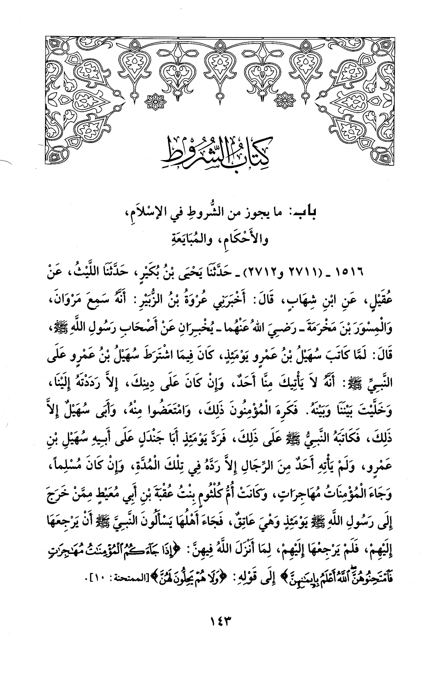 1516 - (2711 و 2712) - حَدَّثَنَا يَحْيىَ بْنُ بُكَيْرٍ، حَدَّثَنَا اللَّيْثُ، عَنْ عُقَيْلٍ، عَنِ ابْنِ شِهَابٍ، قَالَ: أَخْبَرَنِي عُرْوَةُ بْنُ الزُّبَيْرِ: أَنَّهُ سَمِعَ مَرْوَانَ، وَالْمِسْوَرَ بْنَ مَخْرَمَةَ -رَضِيَ اللهُ عَنْهُما- يُخْبِرَانِ عَنْ أَصْحَابِ رَسُولِ اللهِ - صلى الله عليه وسلم -، قَالَ: لَمَّا كَاتَبَ سُهَيْلُ بْنُ عَمْرٍو يَوْمَئِذٍ، كَانَ فِيمَا اشْتَرَطَ سُهَيْلُ بْنُ عَمْرٍو عَلَى النَّبِيِّ - صلى الله عليه وسلم -: أَنَّهُ لَا يَأْتِيكَ مِنَّا أَحَدٌ، وَإِنْ كَانَ عَلَى دِينِكَ، إِلَّا رَدَدْتَهُ إِلَيْنَا، وَخَلَّيْتَ بَيْنَنَا وَبَيْنَهُ. فَكَرِهَ الْمُؤْمِنُونَ ذَلِكَ، وَامْتَعَضُوا مِنْهُ، وَأَبَى سُهَيْل إِلَّا ذَلِكَ، فَكَاتَبَهُ النَّبِيُّ - صلى الله عليه وسلم - عَلَى ذَلِكَ، فَرَدَّ يَوْمَئِذٍ أَبَا جَنْدَلٍ عَلَى أَبِيهِ سُهَيْلِ بْنِ عَمْرٍو، وَلَمْ يَأْتِهِ أَحَدٌ مِنَ الرِّجَالِ إِلَّا رَدَّهُ فِي تِلْكَ الْمُدَّةِ، وَإِنْ كَانَ مُسْلِماً، وَجَاءَ الْمُؤْمِنَاتُ مُهَاجِرَاتٍ، وكَانَتْ أُمُّ كُلْثُومٍ بِنْتُ عُقْبَةَ بْنِ أَبِي مُعَيْطٍ مِمَّنْ خَرَجَ إِلَى رَسُولِ اللهِ - صلى الله عليه وسلم - يَوْمَئِذٍ وَهْيَ عَاتِقٌ، فَجَاءَ أَهْلُهَا يَسْأَلُونَ النَّبِيَّ - صلى الله عليه وسلم - أَنْ يَرْجِعَهَا إِلَيْهِمْ، فَلَمْ يَرْجِعْهَا إِلَيْهِمْ، لِمَا أَنْزَلَ اللهُ فِيْهِنَّ: {يَاأَيُّهَا الَّذِينَ آمَنُوا إِذَا جَاءَكُمُ الْمُؤْمِنَاتُ مُهَاجِرَاتٍ فَامْتَحِنُوهُنَّ اللَّهُ أَعْلَمُ بِإِيمَانِهِنَّ} إِلَى قَوْلِهِ: {وَلَا هُمْ يَحِلُّونَ لَهُنَّ} [الممتحنة: 10].