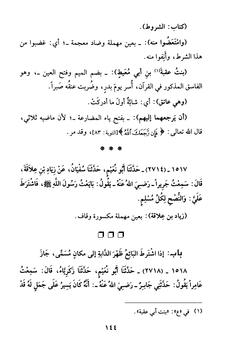 1517 - (2714) - حَدَّثَنَا أَبُو نُعَيْمٍ، حَدَّثَنَا سُفْيَانُ، عَنْ زِيَادِ بْنِ عِلَاقَةَ، قَالَ: سَمِعْتُ جَرِيراً -رَضِيَ اللهُ عَنْهُ- يَقُولُ: بَايَعْتُ رَسُولَ اللهِ - صلى الله عليه وسلم -، فَاشْتَرَطَ عَلَيَّ: وَالنُّصْحِ لِكُلِّ مُسْلِمٍ.
