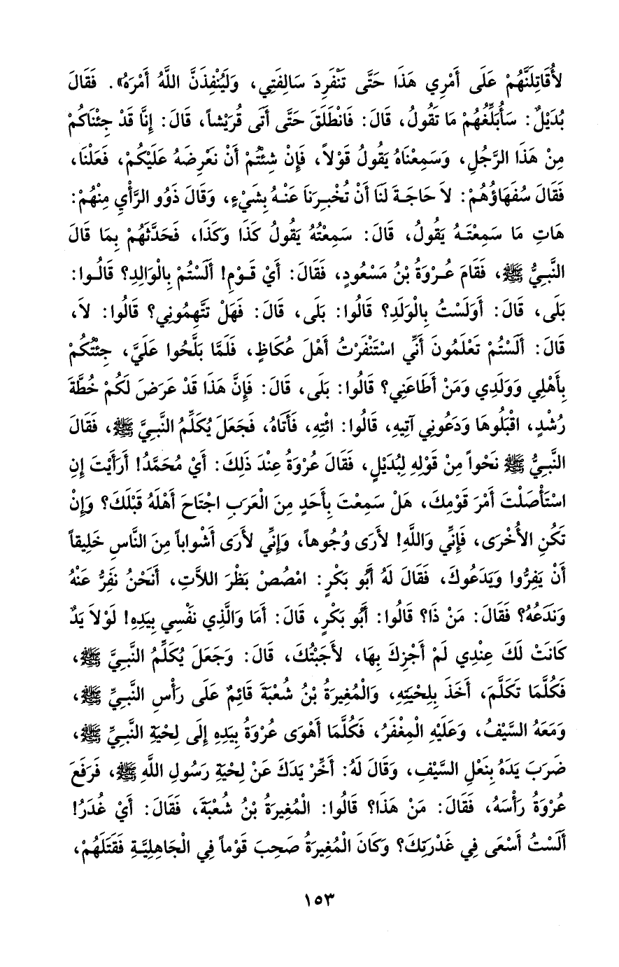 لأُقَاتِلَنَّهُمْ عَلَى أَمْرِي هَذَا حَتَّى تَنْفَرِدَ سَالِفَتِي، وَلَيُنْفِذَنَّ اللهُ أَمْرَهُ". فَقَالَ بُدَيْلٌ: سَأُبَلِّغُهُمْ مَا تَقُولُ، قَالَ: فَانْطَلَقَ حَتَّى أَتَى قُرَيْشاً، قَالَ: إِنَّا قَدْ جِئْنَاكُمْ مِنْ هَذَا الرَّجُلِ، وَسَمِعْنَاهُ يَقُولُ قَوْلًا، فَإنْ شِئْتُمْ أَنْ نَعْرِضَهُ عَلَيْكُمْ، فَعَلْنَا، فَقَالَ سُفَهَاؤُهُمْ: لاَ حَاجَةَ لَنَا أَنْ تُخْبِرَناَ عَنْهُ بِشَيْءٍ، وَقَالَ ذَوُو الرَّأْيِ مِنْهُمْ: هَاتِ مَا سَمِعْتَهُ يَقُولُ، قَالَ: سَمِعْتُهُ يَقُولُ كَذَا وَكَذَا، فَحَدَّثَهُمْ بِمَا قَالَ النَّبِيُّ - صلى الله عليه وسلم -، فَقَامَ عُرْوَةُ بْنُ مَسْعُودٍ، فَقَالَ: أَيْ قَوْمِ! أَلَسْتُمْ بِالْوَالِدِ؛ قَالُوا: بَلَى، قَالَ: أَوَلَسْتُ بِالْوَلَدِ؟ قَالُوا: بَلَى، قَالَ: فَهَلْ تَتَّهِمُونِي؟ قَالُوا: لَا، قَالَ: أَلَسْتُمْ تَعْلَمُونَ أَنِّي اسْتَنْفَرْتُ أَهْلَ عُكَاظٍ، فَلَمَّا بَلَّحُوا عَلَيَّ، جِئْتُكُمْ بِأَهْلِي وَوَلَدِي وَمَنْ أَطَاعَنِي؟ قَالُوا: بَلَى، قَالَ: فَإِنَّ هَذَا قَدْ عَرَضَ لَكُمْ خُطَّةَ رُشْدٍ، اقْبَلُوهَا وَدَعُونِي آتِيهِ، قَالُوا: ائْتِهِ، فَأَتَاهُ، فَجَعَلَ يُكَلِّمُ النَّبِيَّ - صلى الله عليه وسلم -، فَقَالَ النَّبِيُّ - صلى الله عليه وسلم -، نَحْواً مِنْ قَوْلهِ لِبُدَيْلٍ، فَقَالَ عُرْوَةُ عِنْدَ ذَلِكَ: أَيْ مُحَمَّدُ! أَرَأَيْتَ إِنِ اسْتَأْصَلْتَ أَمْرَ قَوْمِكَ، هَلْ سَمِعْتَ بِأَحَدٍ مِنَ الْعَرَبِ اجْتَاحَ أَهْلَهُ قَبْلَكَ؟ وَإِنْ تَكُنِ الأُخْرَى، فَإِنِّي وَاللهِ! لأَرَى وُجُوهاً، وَإِنِّي لأَرَى أَشْواباً مِنَ النَّاسِ خَلِيقاً أَنْ يَفِرُّوا وَيَدَعُوكَ، فَقَالَ لَهُ أَبُو بَكْرٍ: امْصُصْ بَظْرَ اللاَّتِ، أَنَحْنُ نَفِرُّ عَنْهُ وَنَدَعُهُ؟ فَقَالَ: مَنْ ذَا؟ قَالُوا: أَبُو بَكْرٍ، قَالَ: أَمَا وَالَّذِي نَفْسِي بِيَدِهِ! لَوْلَا يَدٌ كَانَتْ لَكَ عِنْدِي لَمْ أَجْزِكَ بِهَا، لأَجَبْتُكَ، قَالَ: وَجَعَلَ يُكَلِّمُ النَّبِيَّ - صلى الله عليه وسلم -، فَكُلَّمَا تَكَلَّمَ، أَخَذَ بِلِحْيَتِهِ، وَالْمُغِيرَةُ بْنُ شُعْبَةَ قَائِمٌ عَلَى رَأْسِ النَّبِيِّ - صلى الله عليه وسلم -، وَمَعَهُ السَّيْفُ، وَعَلَيْهِ الْمِغْفَرُ، فَكُلَّمَا أَهْوَى عُرْوَةُ بِيَدِهِ إِلَى لِحْيَةِ النَّبِيِّ - صلى الله عليه وسلم -، ضَرَبَ يَدَهُ بِنَعْلِ السَّيْفِ، وَقَالَ لَهُ: أَخِّرْ يَدَكَ عَنْ لِحْيَةِ رَسُولِ اللهِ - صلى الله عليه وسلم -، فَرَفَعَ عُرْوَةُ رَأْسَهُ، فَقَالَ: مَنْ هَذَا؟ قَالُوا: الْمُغِيرَةُ بْنُ شُعْبَةَ، فَقَالَ: أَيْ غُدَرُ! أَلَسْتُ أَسْعَى فِي غَدْرَتِكَ؟ وَكَانَ الْمُغِيرَةُ صَحِبَ قَوْماً فِي الْجَاهِلِيَّةِ فَقَتَلَهُمْ،