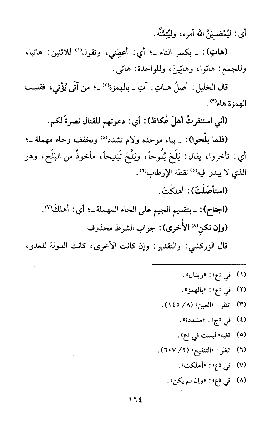 قال الخليل: أصلُ هاتِ: آتِ -بالهمزة (¬2) -؛ من آتَى يُؤْتي، فقلبت الهمزة هاء (¬3).