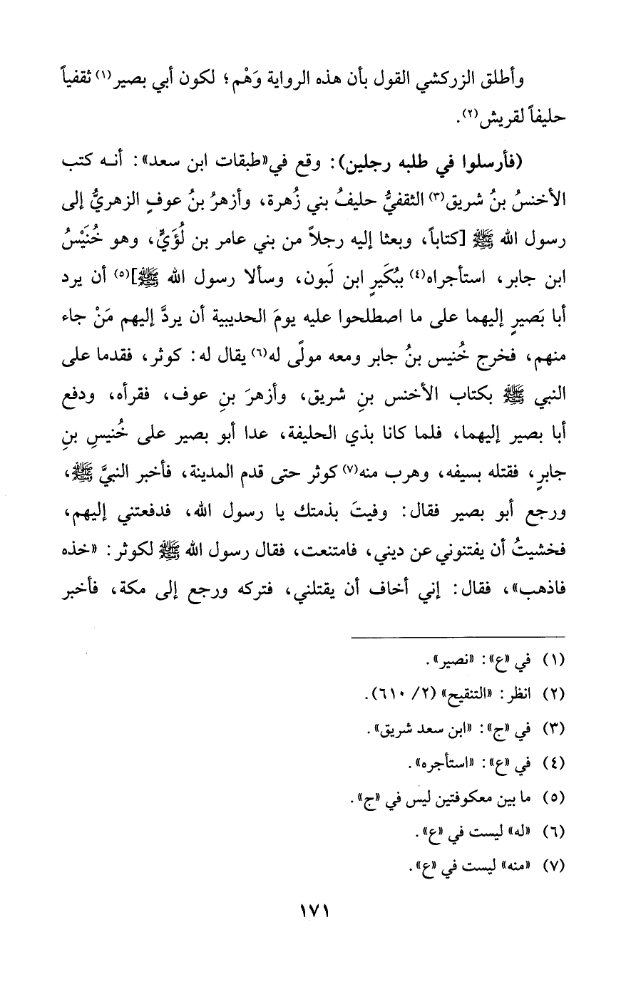 وأطلق الزركشي القول بأن هذه الرواية وَهْم؛ لكون أبي بصير (¬1) ثقفياً حليفاً لقريش (¬2).
