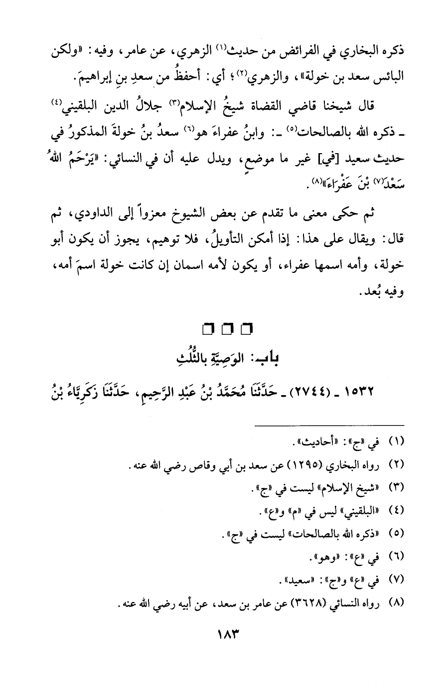 قال شيخنا قاضي القضاة شيخُ الإسلام (¬3) جلالُ الدين البلقيني (¬4) -ذكره الله بالصالحات (¬5) -: وابنُ عفراءَ هو (¬6) سعدُ بنُ خولةَ المذكورُ في حديث سعيد [في] غير ما موضعٍ، ويدل عليه أن في النسائي: "يَرْحَمُ اللهُ سَعْدَ (¬7) بْنَ عَفْرَاءَ" (¬8).