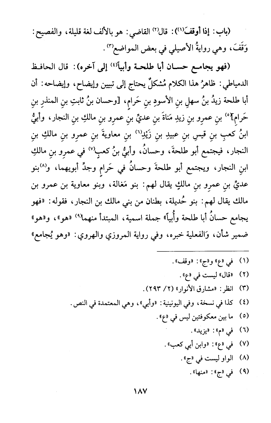 (فهو يجامع حسان أبا طلحة وأبياً (¬4) إلى آخره): قال الحافظ الدمياطي: ظاهرُ هذا الكلام مُشكلٌ يحتاج إلى تبيين وإيضاح، وإيضاحه: أن أبا طلحة زيدُ بنُ سهلِ بنِ الأسودِ بنِ حَرامٍ، [وحسان بنُ ثابتِ بنِ المنذرِ بنِ حَرامِ] (¬5) بنِ عمرِو بنِ زيدِ مَناةَ بنِ عديِّ بنِ عمرِو بنِ مالكِ بنِ النجار، وأبيُّ ابنُ كعبِ بنِ قيسِ بنِ عبيدِ بنِ زَيْدِ (¬6) بنِ معاويةَ بنِ عمرِو بنِ مالكِ بنِ النجار، فيجتمع أبو طلحةَ، وحسانُ، وأبيُّ بنُ كعبٍ (¬7) في عمرِو بنِ مالكِ ابنِ النجار، ويجتمع أبو طلحةَ وحسانُ في حَرامٍ وجدِّ أبويهما، و (¬8) بنو عديِّ بنِ عمرِو بنِ مالكٍ يقال لهم: بنو مَغالة، وبنو معاوية بن عمرو بن مالك يقال لهم: بنو حُديلة، بطنان من بني مالك بن النجار، فقوله: "فهو يجامع حسانُ أبا طلحة وأُبياً" جملة اسمية، المبتدأ منهما (¬9) "هو"، و"هو" ضمير شأن، وَالفعلية خبره، وفي رواية المروزي والهروي: "وهو يُجامع"