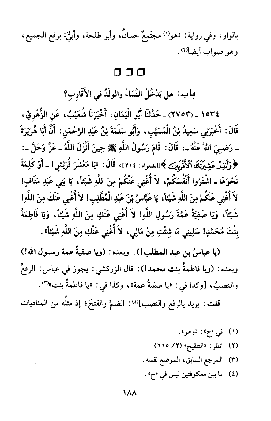 (يا عباسُ بن عبد المطلب!): وبعده: (ويا صفيةُ عمة رسول الله!) وبعده: (ويا فاطمةُ بنت محمد!): قال الزركشي: يجوز في عباس: الرفعُ والنصبُ، [وكذا في: "يا صفيةُ عمة"، وكذا في: "يا فاطمةُ بنت" (¬3).
