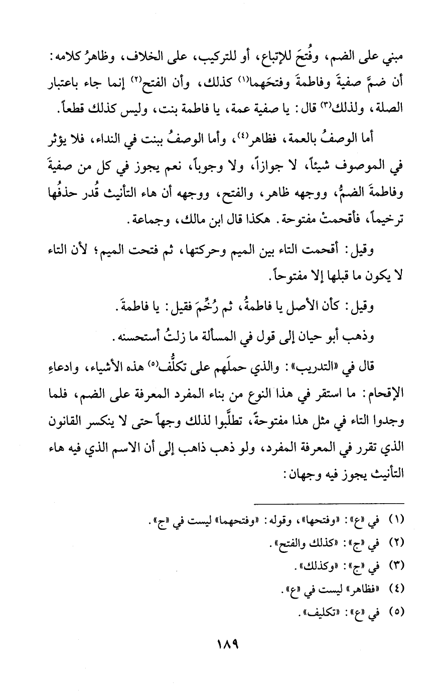 قال في "التدريب": والذي حملَهم على تكلُّف (¬5) هذه الأشياء، وادعاءِ الإقحام: ما استقر في هذا النوع من بناء المفرد المعرفة على الضم، فلما وجدوا التاء في مثل هذا مفتوحةً، تطلَّبوا لذلك وجهاً حتى لا ينكسر القانون الذي تقرر في المعرفة المفرد، ولو ذهب ذاهب إلى أن الاسم الذي فيه هاء التأنيث يجوز فيه وجهان: