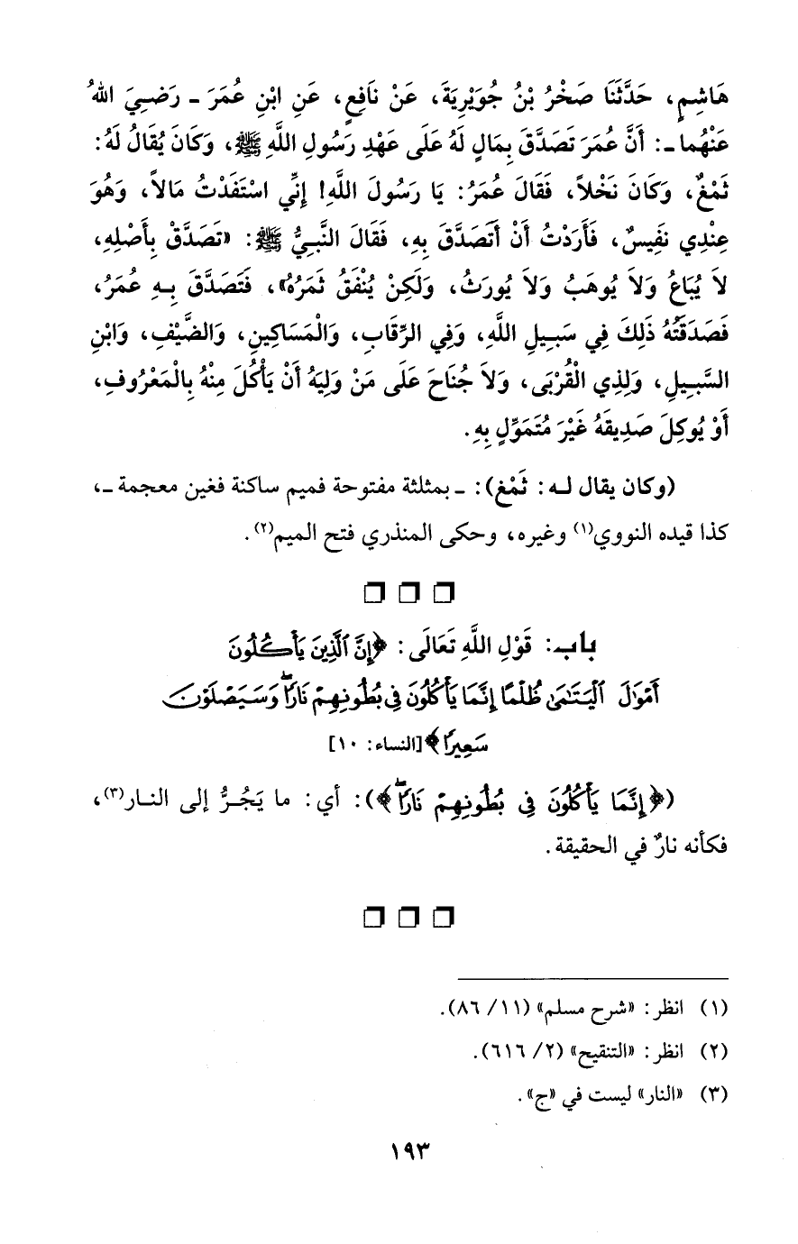 هَاشِمٍ، حَدَّثَنَا صَخْرُ بْنُ جُوَيْرِيَةَ، عَنْ ناَفِعٍ، عَنِ ابْنِ عُمَرَ -رَضِيَ اللهُ عَنْهُما-: أَنَّ عُمَرَ تَصَدَّقَ بِمَالٍ لَهُ عَلَى عَهْدِ رَسُولِ اللهِ - صلى الله عليه وسلم -، وَكَانَ يُقَالُ لَهُ: ثَمْغٌ، وَكَانَ نَخْلاً، فَقَالَ عُمَرُ: يَا رَسُولَ اللهِ! إِنِّي اسْتَفَدْتُ مَالاً، وَهُوَ عِنْدِي نَفِيسٌ، فَأَرَدْتُ أَنْ أَتَصَدَّقَ بِهِ، فَقَالَ النَّبِيُّ - صلى الله عليه وسلم -: "تَصَدَقْ بِأَصْلِهِ، لاَ يُبَاعُ وَلاَ يُوهَبُ وَلاَ يُورَثُ، وَلَكِنْ يُنْفَقُ ثَمَرُهُ"، فَتَصَدَّقَ بِهِ عُمَرُ، فَصَدَقَتُهُ ذَلِكَ فِي سَبِيلِ اللهِ، وَفِي الرِّقَابِ، وَالْمَسَاكِينِ، وَالضَّيْفِ، وَابْنِ السَّبِيلِ، وَلذِي الْقُرْبَى، وَلاَ جُنَاحَ عَلَى مَنْ وَلِيَهُ أَنْ يَأْكُلَ مِنْهُ بِالْمَعْرُوفِ، أَوْ يُوكِلَ صَدِيقَهُ غَيْرَ مُتَمَوِّلٍ بِهِ.