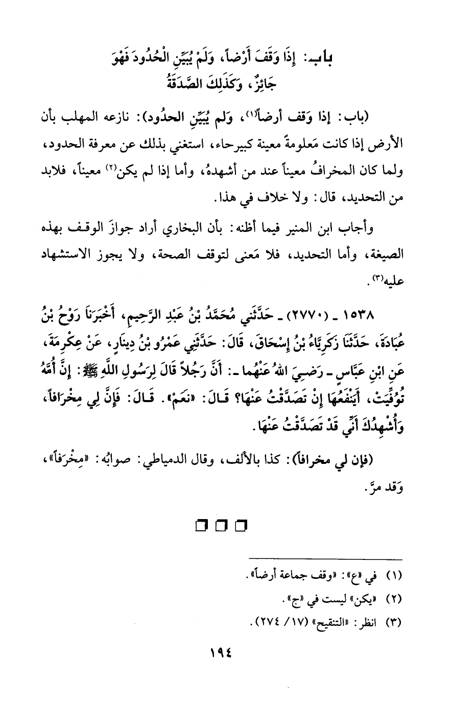 (باب: إذا وَقف أرضاً (¬1)، وَلم يُبَيِّنِ الحدُود): نازعه المهلب بأن الأرض إذا كانت مَعلومةً معينة كبير حاء، استغني بذلك عن معرفة الحدود، ولما كان المخرافُ معيناً عند من أشهدهُ، وأما إذا لم يكن (¬2) معيناً، فلابد من التحديد، قال: ولا خلاف في هذا.