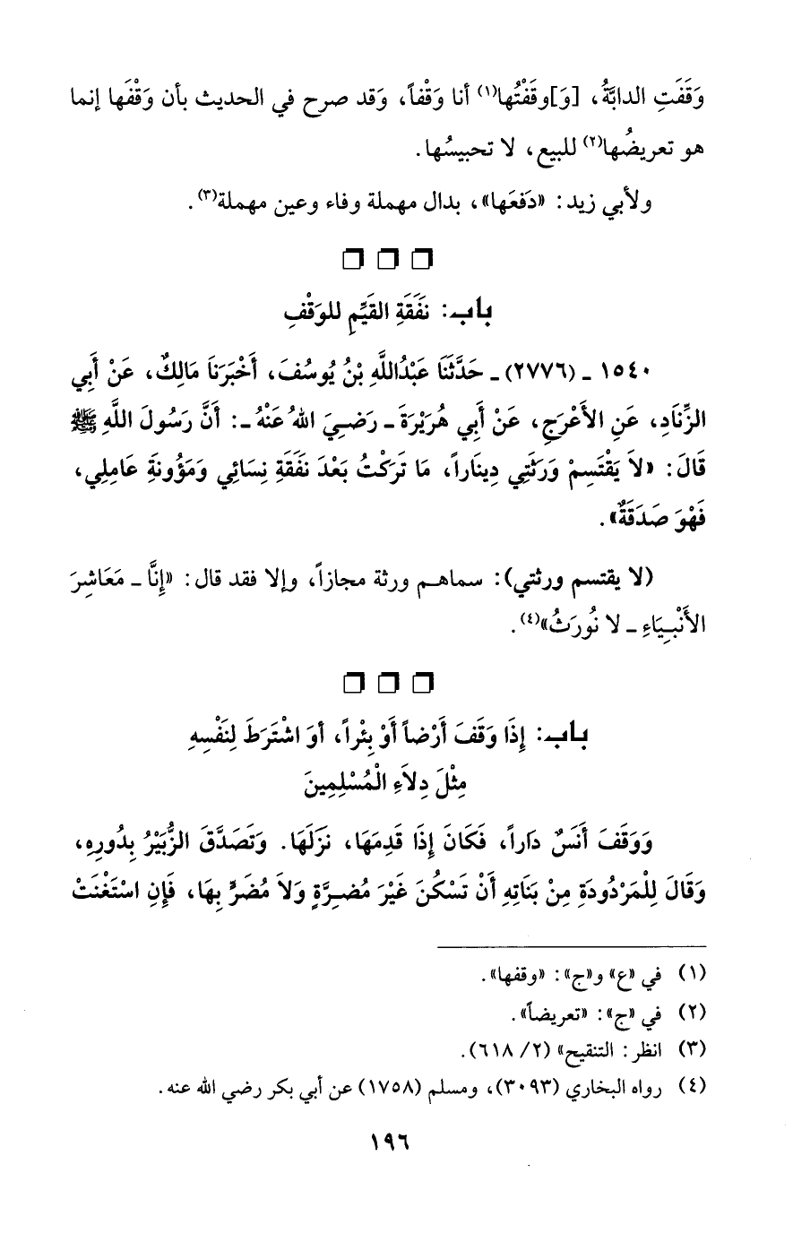 1540 - (2776) - حَدَّثَنَا عَبْدُ اللهِ بْنُ يُوسُفَ، أَخْبَرَناَ مَالِكٌ، عَنْ أَبِي الزِّناَدِ، عَنِ الأَعْرَجِ، عَنْ أِبي هُرَيْرَةَ -رَضِيَ اللهُ عَنْهُ-: أَنَّ رَسُولَ اللهِ - صلى الله عليه وسلم - قَالَ: "لاَ يَقْتَسِمْ وَرَثَتِي دِينَاراً، مَا تَرَكْتُ بَعْدَ نَفَقَةِ نِسَائِي وَمَؤُونَةِ عَامِلِي، فَهْوَ صَدَقَةٌ".
