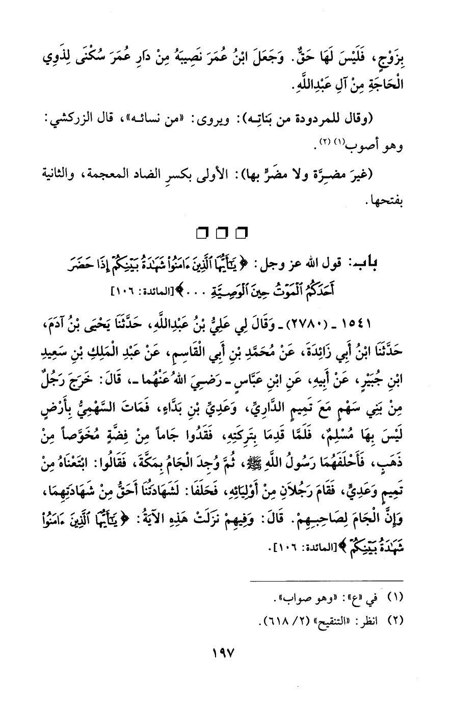 1541 - (2780) - وَقَالَ لِي عَلِيُّ بْنُ عَبْدِ اللهِ، حَدَّثَنَا يَحْيَى بْنُ آدَمَ، حَدَّثَنَا ابْنُ أَبِي زَائِدَةَ، عَنْ مُحَمَّدِ بْنِ أَبِي الْقَاسِمِ، عَنْ عَبْدِ الْمَلِكِ بْنِ سَعِيدِ ابْنِ جُبَيْرٍ، عَنْ أَبِيهِ، عَنِ ابْنِ عَبَّاسٍ -رَضِيَ اللهُ عَنْهُما-، قَالَ: خَرَجَ رَجُلٌ مِنْ بَنِي سَهْمٍ مَعَ تَمِيمٍ الدَّارِيِّ، وَعَدِيِّ بْنِ بَدَّاءٍ، فَمَاتَ السَّهْمِيُّ بِأَرْضٍ لَيْسَ بِهَا مُسْلِمٌ، فَلَمَّا قَدِمَا بِتَرِكَتِهِ، فَقَدُوا جَاماً مِنْ فِضَّةٍ مُخَوَّصاً مِنْ ذَهَبٍ، فَأَحْلَفَهُمَا رَسُولُ اللهِ - صلى الله عليه وسلم -، ثُمَّ وُجِدَ الْجَامُ بِمَكَّةَ، فَقَالُوا: ابْتَعْنَاهُ مِنْ تَمِيمٍ وَعَدِيٍّ، فَقَامَ رَجُلاَنِ مِنْ أَوْلِيَائِهِ، فَحَلَفَا: لَشَهَادَتُنَا أَحَقُّ مِنْ شَهَادَتِهمَا، وَإِنَّ الْجَامَ لِصَاحِبِهِمْ. قَالَ: وَفِيهِمْ نَزَلَتْ هَذِهِ الآيَةُ: {يَاأَيُّهَا الَّذِينَ آمَنُوا شَهَادَةُ بَيْنِكُمْ} [المائدة: 106].