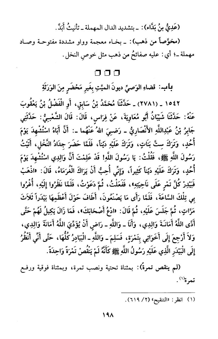 1542 - (2781) - حَدَّثَنَا مُحَمَّدُ بْنُ سَابِقٍ، أَوِ الْفَضْلُ بْنُ يَعْقُوبَ عَنْهُ: حَدَّثَنَا شَيْبَانُ أَبُو مُعَاوِيَةَ، عَنْ فِرَاسٍ، قَالَ: قَالَ الشَّعْبِيُّ: حَدَّثَنِي جَابِرُ بْنُ عَبْدِ اللهِ الأَنْصَارِيُّ -رَضِيَ اللهُ عَنْهُما-: أَنَّ أَبَاهُ اسْتُشْهِدَ يَوْمَ أُحُدٍ، وَتَرَكَ سِتَّ بَنَاتٍ، وَتَرَكَ عَلَيْهِ دَيْناً، فَلَمَّا حَضَرَ جِدَادُ النَّخْلِ، أتَيْتُ رَسُولَ اللهِ - صلى الله عليه وسلم -، فَقُلْتُ: يَا رَسُولَ اللهِ! قَدْ عَلِمْتَ أَنَّ وَالِدِي اسْتُشْهِدَ يَوْمَ أُحُدٍ، وَتَرَكَ عَلَيْهِ دَيْناً كَثِيراً، وَإنِّي أُحِبُّ أَنْ يَرَاكَ الْغُرَمَاءُ، قَالَ: "اذْهَبْ فَبَيْدِرْ كُلَّ تَمْرٍ عَلَى ناَحِيَتِهِ"، فَفَعَلْتُ، ثُمَّ دَعَوْتُ، فَلَمَّا نَظَرُوا إِلَيْهِ، أُغْرُوا بِي تِلْكَ السَّاعَةَ، فَلَمَّا رَأَى مَا يَصْنَعُونَ، أَطَافَ حَوْلَ أَعْظَمِهَا بَيْدَراً ثَلاَثَ مَرَّاتٍ، ثُمَّ جَلَسَ عَلَيْهِ، ثُمَّ قَالَ: "ادْعُ أَصْحَابَكَ"، فَمَا زَالَ يَكِيلُ لَهُمْ حَتَّى أَدَّى اللهُ أَمَانَةَ وَالِدِي، وَأَناَ -وَاللهِ- رَاضٍ أَنْ يُؤَدِّيَ اللهُ أَمَانَةَ وَالِدِي، وَلاَ أَرْجِعَ إِلَى أَخَوَاتِي بِتَمْرَةٍ، فَسَلِمَ -وَاللهِ- الْبَيَادِرُ كُلُّهَا، حَتَّى أنَّي أَنْظُرُ إِلَى الْبَيْدَرِ الَّذِي عَلَيْهِ رَسُولُ اللهِ - صلى الله عليه وسلم - كَأَنَّهُ لَمْ يَنْقُصْ تَمْرَةً وَاحِدَةً.
