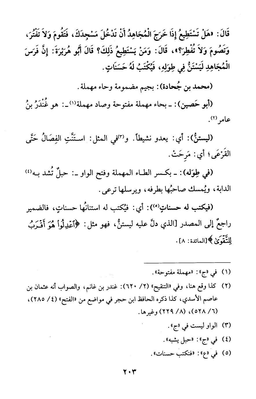 قَالَ: "هَلْ تَسْتَطِيعُ إِذَا خَرَجَ الْمُجَاهِدُ أَنْ تَدْخُلَ مَسْجِدَكَ، فَتَقُومَ وَلاَ تَفْتُرَ، وَتَصُومَ وَلاَ تُفْطِرَ؟ "، قَالَ: وَمَنْ يَسْتَطِيعُ ذَلِكَ؟ قَالَ أَبُو هُرَيْرَةَ: إِنَّ فَرَسَ الْمُجَاهِدِ لَيَسْتَنُّ فِي طِوَلهِ، فَيُكْتَبُ لَهُ حَسَنَاتٍ.