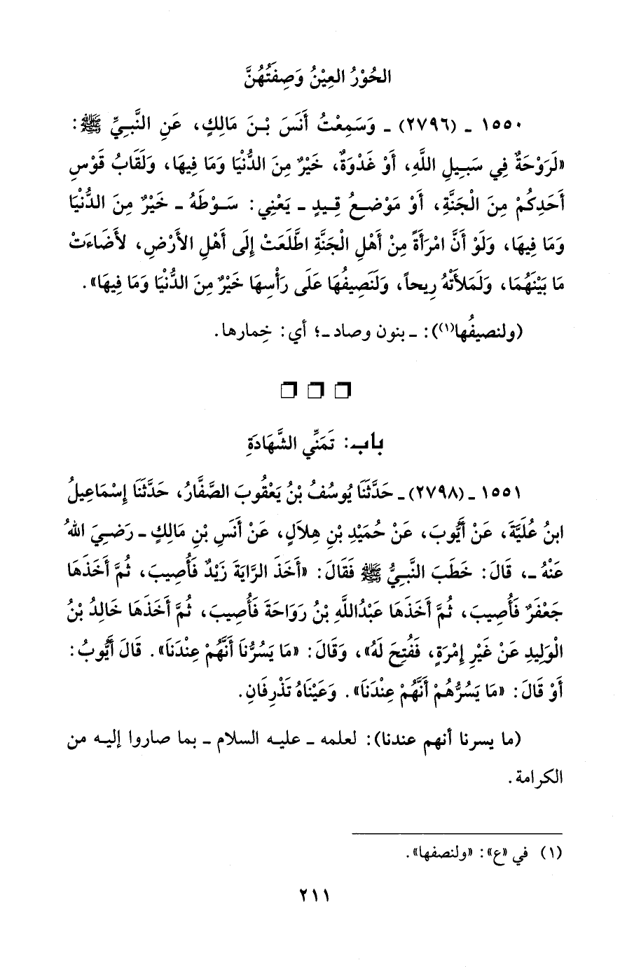 1550 - (2796) - وَسَمِعْتُ أَنَسَ بْنَ مَالِكٍ، عَنِ النَّبِيِّ - صلى الله عليه وسلم -: "لَرَوْحَةٌ فِي سَبِيلِ اللهِ، أَوْ غَدْوَةٌ، خَيْرٌ مِنَ الدُّنْيَا وَمَا فِيهَا، وَلَقَابُ قَوْسِ أَحَدِكُمْ مِنَ الْجَنَّةِ، أَوْ مَوْضعُ قِيدٍ -يَعْنِي: سَوْطَهُ- خَيْرٌ مِنَ الدُّنْيَا وَمَا فِيهَا، وَلَوْ أَنَّ امْرَأَةً مِنْ أَهْلِ الْجَنَّةِ اطَّلَعَتْ إِلَى أَهْلِ الأَرْضِ، لأَضَاءَتْ مَا بَيْنَهُمَا، وَلَمَلأَتْهُ رِيحاً، وَلَنَصِيفُهَا عَلَى رَأْسِهَا خَيْرٌ مِنَ الدُّنْيَا وَمَا فِيهَا".