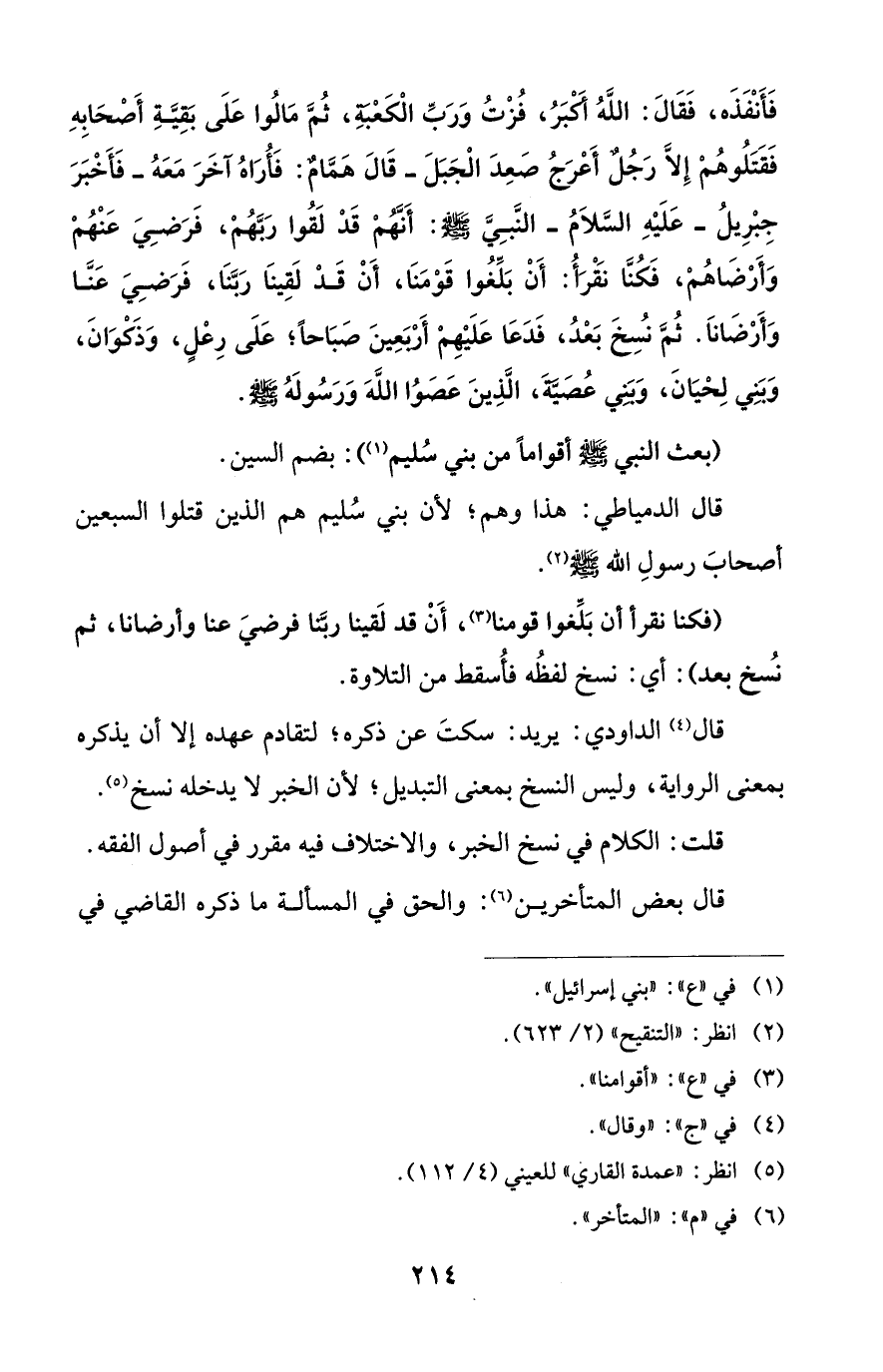 فَأَنْفَذَه، فَقَالَ: اللهُ أَكْبَرُ، فُزْتُ وَرَبِّ الْكَعْبَةِ، ثُمَّ مَالُوا عَلَى بَقِيَّةِ أَصْحَابِهِ فَقَتَلُوهُمْ إِلاَّ رَجُلٌ أَعْرَجُ صَعِدَ الْجَبَلَ -قَالَ هَمَّامٌ: فَأُرَاهُ آخَرَ مَعَهُ -فَأَخْبَرَ جِبْرِيلُ -عَلَيْهِ السَّلاَمُ- النَّبِيَّ - صلى الله عليه وسلم -: أَنَّهُمْ قَدْ لَقُوا رَبَّهُمْ، فَرَضِيَ عَنْهُمْ وَأَرْضَاهُمْ، فَكُنَّا نَقْرَأُ: أَنْ بَلِّغُوا قَوْمَنَا، أَنْ قَدْ لَقِينَا رَبَّنَا، فَرَضِيَ عَنَّا وَأَرْضَاناَ. ثُمَّ نُسِخَ بَعْدُ، فَدَعَا عَلَيْهِمْ أَرْبَعِينَ صَبَاحاً؛ عَلَى رِعْلٍ، وَذَكْوَانَ، وَبَنِي لِحْيَانَ، وَبَنِي عُصَيَّةَ، الَّذِينَ عَصَوُا اللهَ وَرَسُولَهُ - صلى الله عليه وسلم -.
