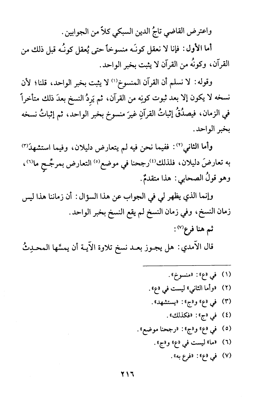 أما الأول: فإنا لا نعقل كونَه منسوخاً حتى يُعقل كونُه قبل ذلك من القرآن، وكونُه من القرآن لا يثبت بخبر الواحد.