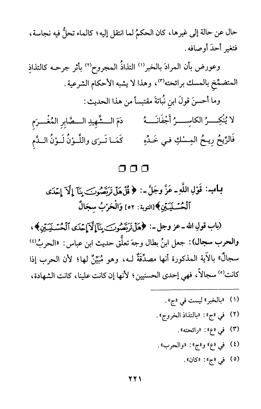 باب: قَوْلِ اللهِ -عَزَّ وجَلَّ-: {قُلْ هَلْ تَرَبَّصُونَ بِنَا إِلَّا إِحْدَى الْحُسْنَيَيْنِ} [التوبة: 52] وَالْحَرْبُ سِجَالٌ