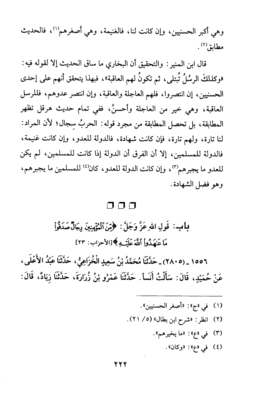 قال ابن المنير: والتحقيق أن البخاري ما ساق الحديث إلا لقوله فيه: "وكذلكَ الرسُلُ تُبتلى، ثم تكونُ لهم العاقبة"، فبهذا يتحقق أنهم على إحدى الحسنيين، إن انتصروا، فلهم العاجلة والعاقبة، وإن انتصر عدوهم، فللرسل العاقبة، وهي خير من العاجلة وأحسنُ، ففي تمام حديث هرقل تظهر المطابقة، بل تحصل المطابقة من مجرد قوله: الحربُ سِجال؛ لأن المراد: لنا تارة، ولهم تارة، فإن كانت شهادة، فالدولة للعدو، وإن كانت غنيمة، فالدولة للمسلمين، إلا أن الفرق أن الدولة إذا كانت للمسلمين، لم يكن للعدو ما يجبرهم (¬3)، وإن كانت الدولة للعدو، كان (¬4) للمسلمين ما يجبرهم، وهو فضل الشهادة.