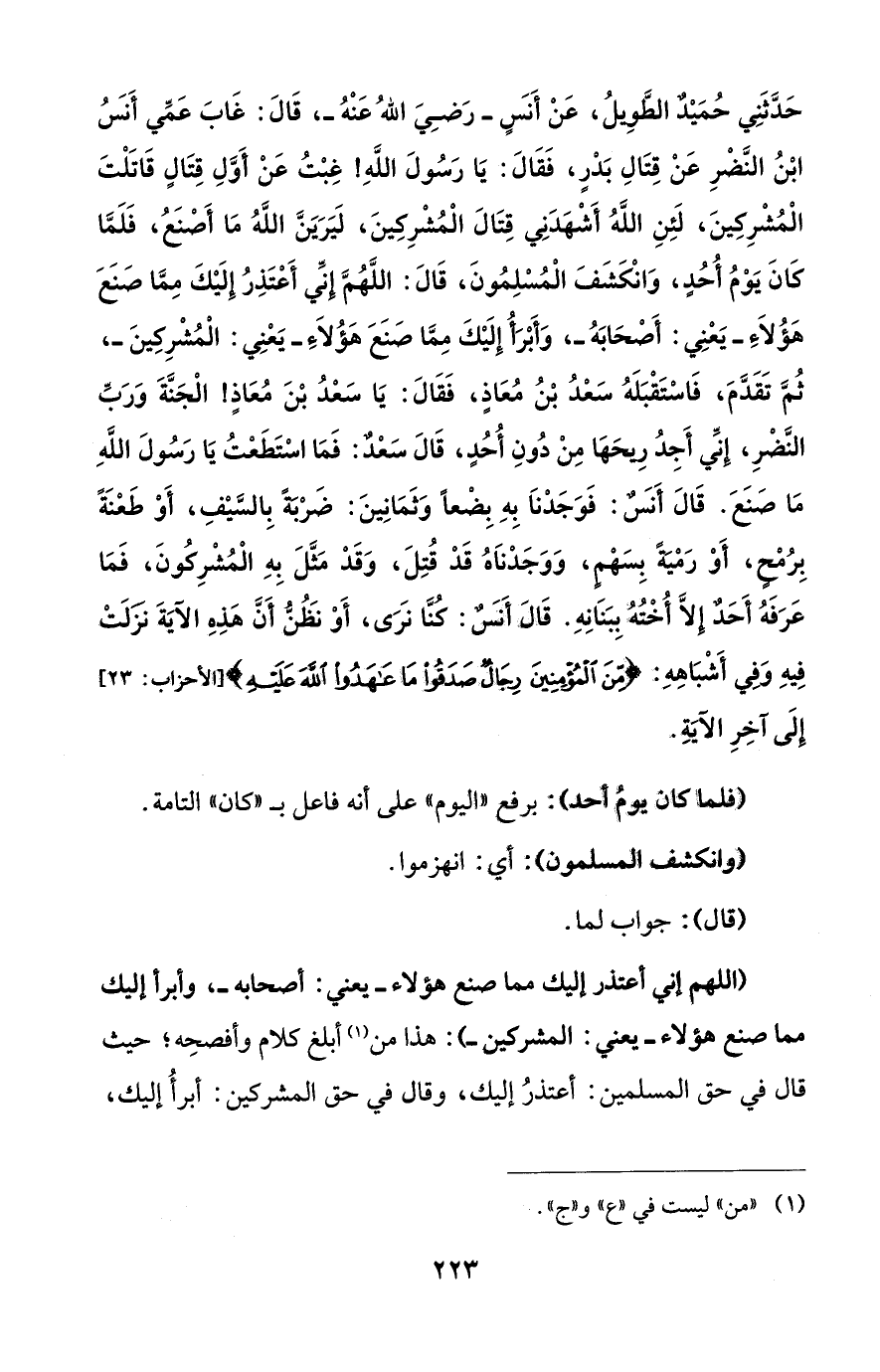 حَدَّثَنِي حُمَيْدٌ الطَّوِيلُ، عَنْ أَنَسٍ -رَضِيَ اللهُ عَنْهُ-، قَالَ: غَابَ عَمِّي أَنَسُ ابْنُ النَّضْرِ عَنْ قِتَالِ بَدْرٍ، فَقَالَ: يَا رَسُولَ اللهِ! غِبْتُ عَنْ أَوَّلِ قِتَالٍ قَاتَلْتَ الْمُشْرِكِينَ، لَئِنِ اللهُ أَشْهَدَنِي قِتَالَ الْمُشْرِكِينَ، لَيَرَيَنَّ اللهُ مَا أَصْنعُ، فَلَمَّا كَانَ يَوْمُ أُحُدٍ، وَانْكَشَفَ الْمُسْلِمُونَ، قَالَ: اللَّهُمَّ إنِّي أَعْتَذِرُ إِلَيْكَ مِمَّا صَنَعَ هَؤُلاَءِ -يَعْنِي: أَصْحَابَهُ-، وَأَبْرَأُ إِلَيْكَ مِمَّا صَنَعَ هَؤُلاَءِ -يَعْنِي: الْمُشْرِكينَ-، ثُمَّ تَقَدَّمَ، فَاسْتَقْبَلَهُ سَعْدُ بْنُ مُعَاذٍ، فَقَالَ: يَا سَعْدُ بْنَ مُعَاذٍ! الْجَنَّةَ وَرَبِّ النَّضْرِ، إنِّي أَجِدُ رِيحَهَا مِنْ دُونِ أُحُدٍ، قَالَ سَعْدٌ: فَمَا اسْتَطَعْتُ يَا رَسُولَ اللهِ مَا صَنَعَ. قَالَ أَنَسٌ: فَوَجَدْنَا بِهِ بِضْعاً وَثَمَانِينَ: ضَرْبَةً بِالسَّيْفِ، أَوْ طَعْنَةً بِرُمْحٍ، أَوْ رَمْيَةً بِسَهْمٍ، وَوَجَدْناَهُ قَدْ قُتِلَ، وَقَدْ مَثَّلَ بِهِ الْمُشْرِكُونَ، فَمَا عَرَفَهُ أَحَدٌ إِلاَّ أُخْتُهُ بِبَنَانِهِ. قَالَ أَنَسٌ: كُنَّا نَرَى، أَوْ نظُنُّ أَنَّ هَذِهِ الآيَةَ نَزَلَتْ فِيهِ وَفِي أَشْبَاهِهِ: {مِنَ الْمُؤْمِنِينَ رِجَالٌ صَدَقُوا مَا عَاهَدُوا اللَّهَ عَلَيْهِ} [الأحزاب: 23] إلَى آخِرِ الآيَةِ.